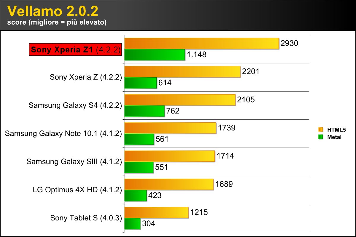 Con Vellamo il disco si ripete ma viene rappresentato un divario ancora più marcato. In particolare, lo score "metal" indica un aumento di prestazioni quasi doppio rispetto a quelle dell'Xperia Z (89% in pù) e un aumento pari al 50% rispetto al Galaxy S4.
