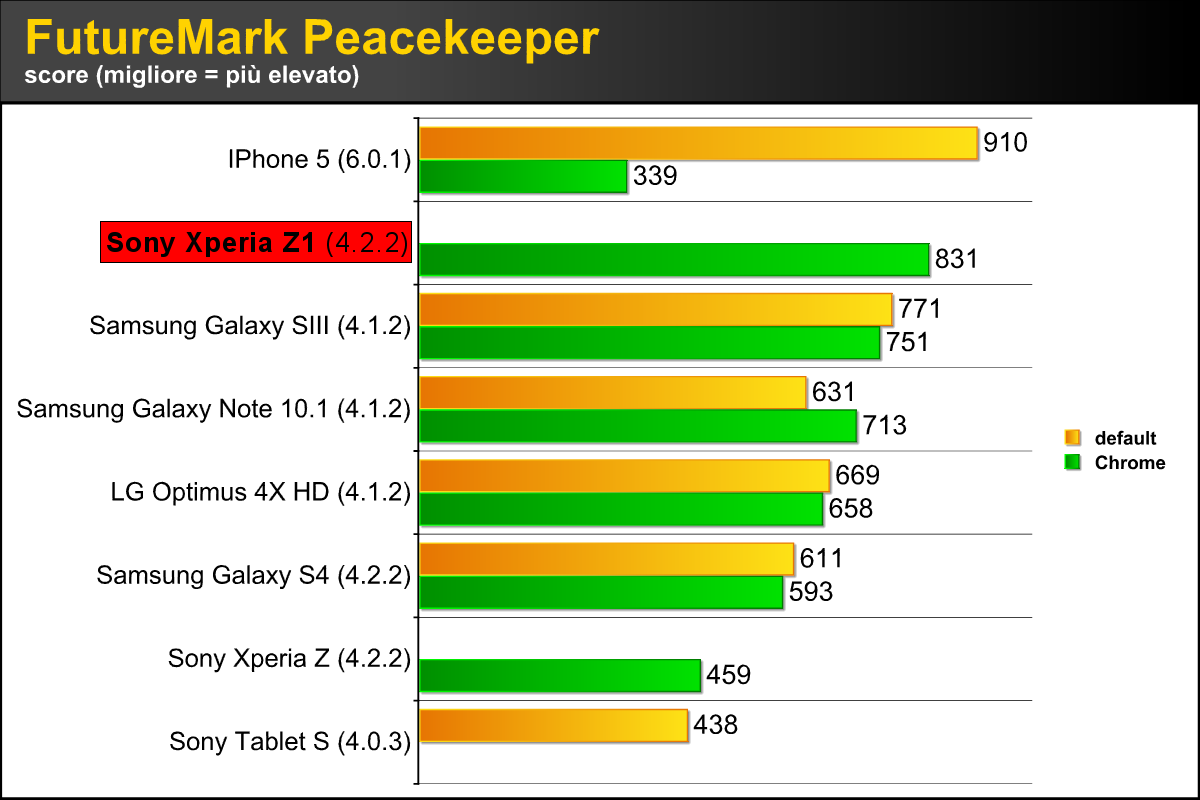 Con Peacekeeper, tradizionalmente più favorevole all'ottimo browser integrato nell'iPhone, il Sony Xperia Z1 non riesce ancora a superare le prestazioni del melafonino ma è comunque sopra tutti gli smartphone con sistema operativo Android, Galaxy S4 compreso.