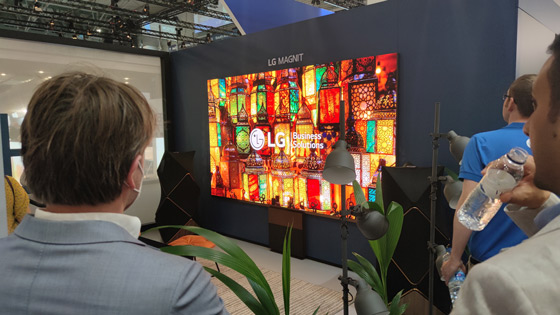 Nella parte education la LG CreateBoard, lavagna interattiva da 65 pollici e il Vidwall con blocchi base da 54 pollici. Al centro dello stand un'isola dedicata al mondo del retail con la ricostruzione di un fast food con monitor ad altà luminosità per l'esterno e monitor da 49 e 55 pollici con risoluzione UHD e l'ultimo arrivato della famiglia Quick service restaurant, display con diagonale da 32" verticale touchscreen, utile per le ordinazioni, all'interno . Nella parte sinistra dello stand in esposizione una pellicola led trasparente di pochi mm di spessore che si applica su vetro e che dispone di 2000 nits di luminanza. A corollario il prodotto di punta l'LG Magnit, monitor con tecnologia MicroLED, progettato principalmente per la segnaletica digitale, ma che si adatta anche all'uso come TV da parete nelle abitazioni più lussuose, con risoluzione Ultra HD 4K e diagonale di 163". Lo compongono diversi moduli (LSAB009) dalla risoluzione di 640x360 pixel e pixel pitch di 0,88 mm.