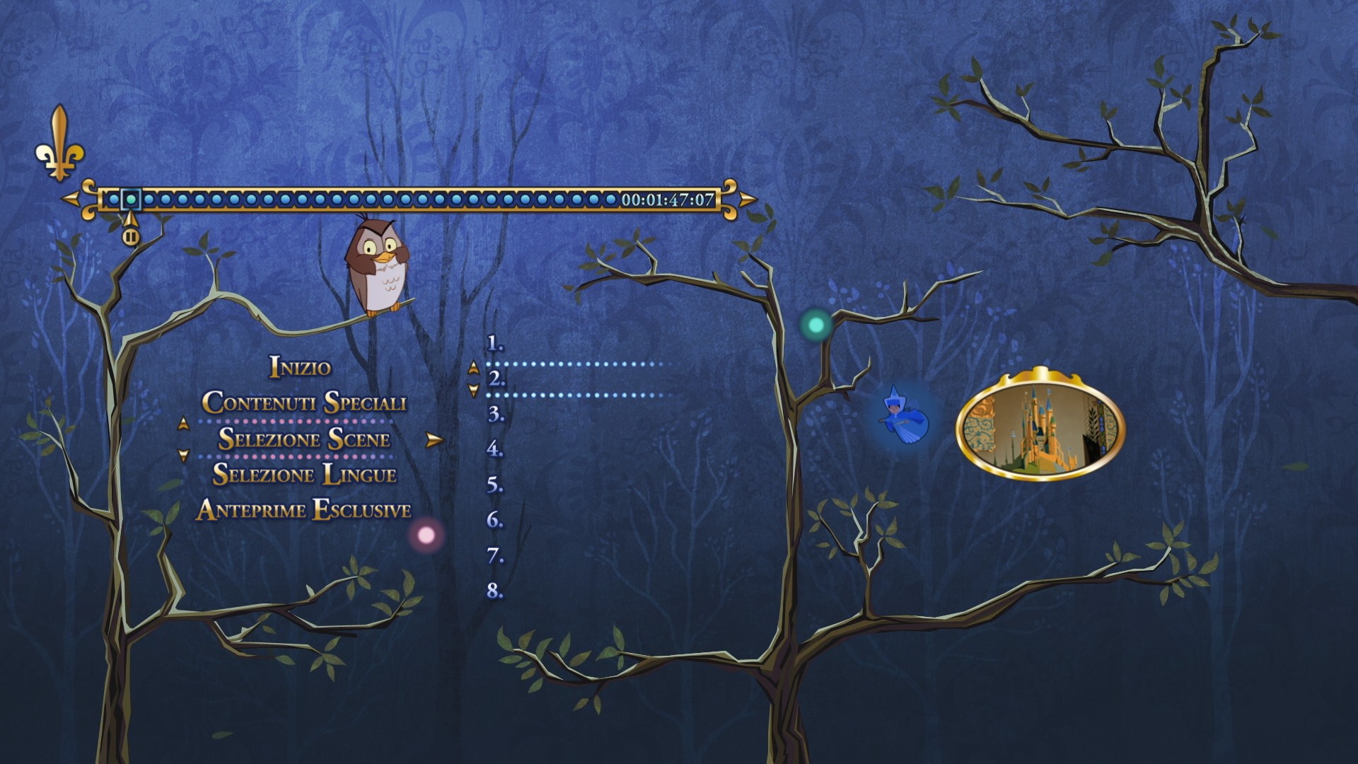 Il film è suddiviso in 30 parti e segue lo stesso schema adottato per il Blu-ray di Ratatouille con la selezione delle scene che non prevede dei raggruppamenti per blocchi (1-4, 5-8, ecc...) ma avviene scorrendo in verticale un menu numerato con preview (un po' piccola) del capitolo evidenziato. Passando alla voce Anteprime Esclusive è possibile deliziarsi con un'autentica chicca, vale a dire il trailer in Alta Definizione dell'edizione restaurata di Pinocchio, il cui Blu-ray è atteso per la primavera dell'anno venturo. Presente anche il trailer di Bolt, il prossimo blockbuster natalizio targato Disney.