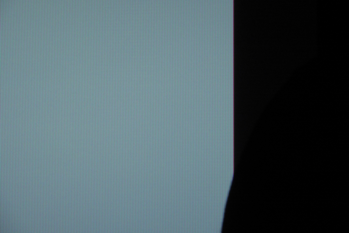 L'ottica dell'esemplare in esame è molto buona, con qualità sensibilmente più elevata rispetto a quella vista sul "golden sample" del modello DLA-N5, sia in termini di aberrazioni cromatiche, sia per quanto riguarda l'uniformità d'illuminazione. Anche se non c'entra molto con l'obiettivo, approfitto per segnalare una uniformità della colorimetria a dir poco eccellente, sia con bianco al 100%, sia con schermate test ad intensità molto più contenuta e fino al 10%. Tornando alle lenti, la capacità di messa a fuoco è ottima, con un'immagine ricca di dettaglio al centro e solo un po' meno nelle zone periferiche, soprattutto ai lati. Nel particolare qui in alto a destra, catturato all'estrema destra dello schermo, notiamo solo una miscorvengenza della componente blu pari a meno di mezzo pixel in senso orizzontale, invisibile già con rapporto di visione 1:1. Le due immagini qui in alto si riferiscono a particolari in periferia (a destra dell'immagine, quasi al bordo) con linee verticali di un solo pixel (a sinistra) e linee verticali di due pixel (linee bianche e nere). Segnalo l'assenza di qualsiasi tipo di ricampionamento delle componenti cromatiche per il controllo delle aberrazioni. Il test del "lanciarazzi" viene superato a pieni voti: la leggibilità dei caratteri più piccoli è molto buona. Il particolare, catturato a mano libera con una fotocamera Lumix GH3, non rende giustizia a quello che abbiamo osservato con i nostri occhi. Segnalo anche che tutte e tre i parametri dell'algoritmo MPC (sharpness, maschera di contrasto e riduzione del rumore) erano impostati a zero. Il flusso luminoso misurato con obiettivo completamente in posizione "wide", con ottica perfettamente al centro, con lampada ad alta potenza, diaframmma completamente aperto, bilanciamento del bianco predefinito di 6.500 kelvin e con soli 5 campionamenti (centro e "medio-periferici"), è di 1.830 lumen, quindi molto vicino ai dati di targa. Probabilmente, misurando al meglio dei 9 punti ANSI, il flusso luminoso dovrebbe scendere di un ulteriore 5%. Per una verifica esatta ho bisogno di un proiettore in laboratorio. Attenzione però perché questo flusso luminoso si riferisce a tutta l'area illuminata con risoluzione nativa di 4096x2160 punti e rapporto d'aspetto in 1,89:1. Scegliendo invece la risoluzione di 3840x2160 e rapporto d'aspetto in 1,78:1, si perde quasi il 6,3% dell'area mentre il flusso luminoso dovrebbe essere più contenuto del 5% (ai lati estremi il proiettore è meno luminoso), scendendo quindi a poco meno di 1.750 lumen. Dopo la calibrazione del bianco con target D65, si scende invece a 1.430 lumen che sono davvero tanti per una lampada vergine con tanto "blu" e "verde" da togliere. Per l'analisi del rapporto di contrasto nativo (full-on / full-off) e di quello intra-frame a vari livelli di APL fino al 50% (ANSI) servirebbe il laboratorio. Nella show-room di Plasmapan, benché fosse ben trattata e ben oscurata, la poca accessibilità della parete con lo schermo (impossibile spostare i diffusori anteriori) e la staticità del proiettore (con il divano di mezzo), mi hanno consentito di misurare solo il punto centrale, con luxmetro rivolto verso il proiettore, con poco margine per variare la distanza in modo da aumentare la dinamica dello strumento. Per questo motivo vi anticipo che la misura del rapporto di contrasto massimo, con diaframma completamente chiuso, è poco attendibile. La misura del rapporto di contrasto con lo schermo Global Commander da 2,8 metri di base è stata di fatto impossibile, poché il livello del nero è al di sotto del range di accuratezza di tutte le sonde che ho portato. Il rapporto di contrasto di "partenza", di circa 20.000:1 è eccellente e vale quasi il doppio rispetto al modello DLA-N5 "Golden Sample" misurato lo scorso ottobre (in quel caso rilevai circa 12.000:1). Con obiettivo in medio.tele, si sale già a 25.000:1 e chiudendo leggermente il diaframma si va oltre 30.000:1. Insomma: le prestazioni di un DLA-X7900 non sono poi così lontane.