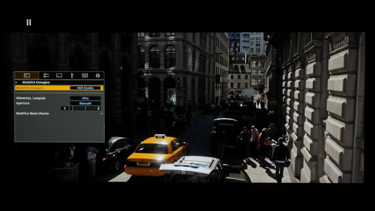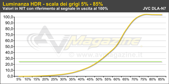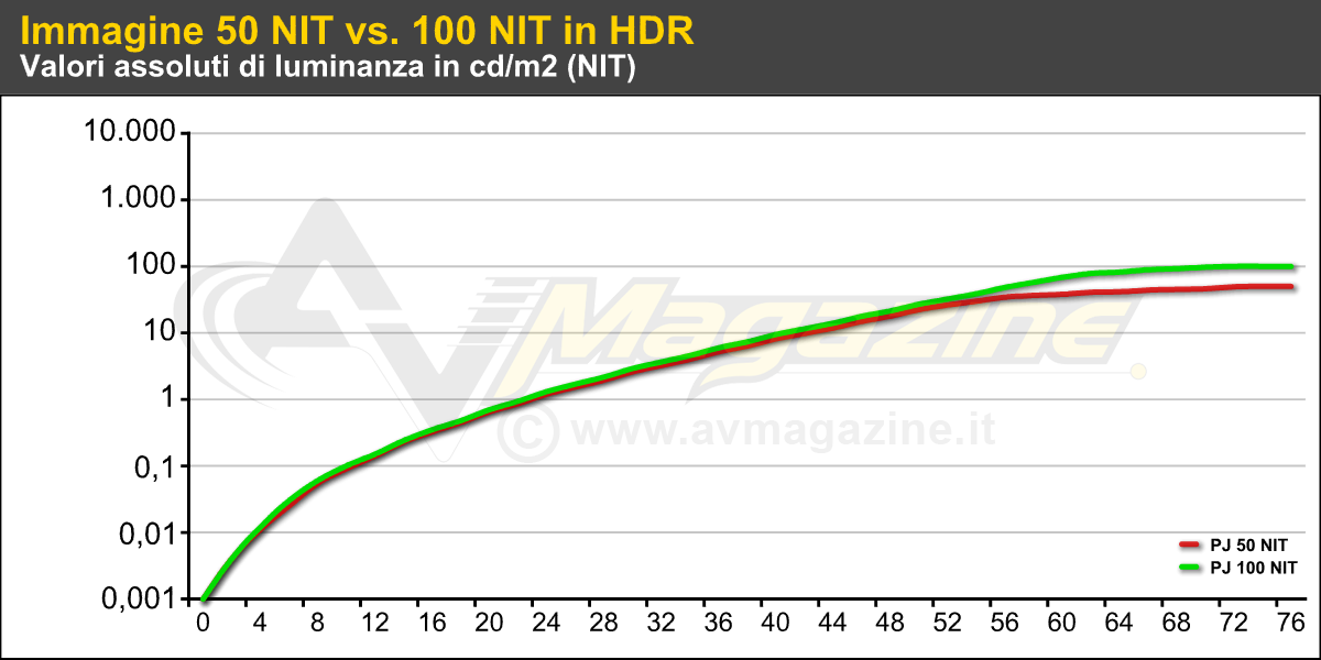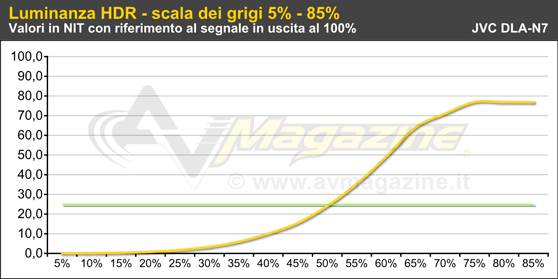 Prima di arrivare alle misure in HDR sul JVC DLA-N7 è necessaria una premessa. La riproduzione dei contenuti HDR per il pubblico vede muovere i suoi primi passi prima di tutto al cinema, piuttosto che sui TV casalinghi, grazie a Dolby e alle sue sale Dolby Cinema (correva l'anno 2014), all'interno delle quali il picco del bianco sullo schermo è di ben 106 NIT (31 FL) e il rapporto di contrasto nativo teorico è di ben 1.000.000:1 (un milione a uno), grazie alla doppia modulazione associata alla tecnologia DLP. In questo caso i contenuti vengono preparati appositamente per le sale Dolby Cinema. Per i contenuti HDR "consumer" invece dobbiamo fare i conti con la curva PQ (SMPTE 2084) che prevede il cosiddetto "bianco diffuso" (50% del segnale in ingresso) a circa 94 NIT e picchi di luminanza nella maggior parte dei casi a 1.000 NIT, in qualche caso anche oltre 2.000 NIT e in teoria fino a 10 volte tanto (il limite massimo è 10.000 NIT). Non dobbiamo però dimenticare che il nostro sistema occhi-cervello ha un suo "gamma", che fa in modo che 500 NIT ci sembrino soltanto due volte più luminosi rispetto a 100 NIT e che tra un "bianco" a 1.000 NIT e un altro a 2.000 NIT ci sia tutto sommato poca differenza. Tornando alla riproduzione casalinga in HDR, pensata soprattutto per i televisori, per la calibrazione dei contenuti bisognerebbe far sì che il display riproduca correttamente il bianco diffuso a 94 NIT e la prima metà della scala dei grigi, dal nero fino al 50%, scendendo a compromessi soltanto per la seconda metà della scala dei grigi, quindi dal 50% al 75% per contenuti che arrivano fino a 1.000 NIT. Per la videoproiezione, in cui tutt'oggi mancano effettivamente riferimenti di luminanza precisi, il mio suggerimento è che il bianco diffuso venga riprodotto ad almeno 20 NIT (meglio se sono 25), a garanzia di immagini abbastanza luminose: se l'ambiente è completamente buio l'occhio si adatta e alla fine la luce complessiva generata da una immagine proiettata su 110" non sarà poi così lontana da quella di un "vassoio" da 55" (cit.). Se poi la combinazione che ho scelto tra flusso luminoso e schermo mi dà la possibilità di generare un picco del bianco superiore ai 100 NIT - come per le sale Dolby Cinema - ho abbastanza margine per modulare la seconda parte della scala dei grigi in maniera corretta. In più, se il mio sistema (proiettore, schermo e ambiente) mi consente di avere un livello del nero molto contenuto e, come in questo caso, posso raggiungere addirittura 130 NIT di picco (in 16:9, con calibrazione D65 e diaframma completamente aperto), i nostri occhi si adattano e il risultato della dinamica sarà molto simile a quello di un OLED con picco di luminanza di 600 NIT, con il vantaggio di poter fare quasi a meno anche del "tone mapping dinamico". Se invece riesco ad arrivare soltanto a 50 NIT di picco (in alcuni casi ho visto installazioni anche con picco di luminanza anche più contenuto), considerando che non bisogna rinuncare ad un bianco diffuso da 25 NIT, non ci sarà abbastanza "margine" per modulare la seconda metà della scala dei grigi tra 25 e 50 NIT e l'immagine sarà un pochino "piatta", molto simile a quella di un Blu-ray HD con gamma dinamica compressa secondo le raccomandazioni REC BT.709. In questo caso, con luminanza così bassa, sarà molto utile un tone mapping dinamico che mi faccia recuperare luminosità quando le scene sono più scure. Tornando al "nostro" JVC DLA-N7 e al flusso luminoso superiore a 1.400 lumen con calibrazione D65, se siete interessati ai contenuti HDR, posso raccomandare l'utilizzo di uno schermo con gain unitario e base non superiore ai 2,8 metri, oppure in caso di schermo ad alto contrasto come il Global Commander con gain di 0.8, non superate 2,5 metri di base. Più piccolo sarà lo schermo, più alto sarà il divertimento in HDR. Per riprodurre contenuti HDR su uno schermo da 3 metri di base con gain 0.8 servirebbero almeno 1.900 lumen. Per 3,6 metri di base servono 2.600 lumen e per 4 metri di base ne servono 3.400. A questi valori andrebbe aggiunto un margine del 25% se non volete cambiare lampada dopo 200 ore... Oppure dovreste considerare un proiettore con sistema d'illuminamento a stato solido, quindi con laser/fosfori oppure LED/fosfori.