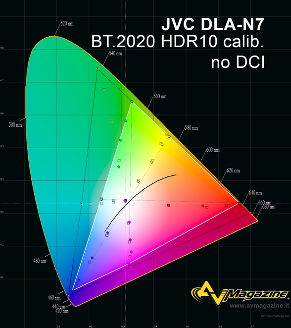 Per la calibrazione in HDR10, lo schermo e la luminanza che si riesce a raggiungere sono parte fondamentale di tutto il processo. Lo schermo Global Commander da 2,8 metri di base, installato nella show-room, ha un rapporto d'aspetto in 21:9, con altezza di 1,2 metri, una superficie virtuale in 16:9 di 4,41 metri quadrati e un gain di 0,8. La porzione in 16:9 ha una larghezza di 2,13 metri e un'area complessiva di 2,56 metri quadrati. Con lampada ad alta potenza e diaframma aperto, ho misurato un picco di luminanza rispettivamente di 80 NIT in 21:9 e di 130 NIT in 16:9, con calibrazione del bianco secondo specifiche D65 (0,313x e 0,329y). Inserendo il filtro colore DCI, il picco di luminanza scende del 20%. Ho scelto quindi di utilizzare il filtro DCI soltanto con i contenuti con rapporto d'aspetto in 16:9 poiché proiettando su 2.8 metri di base, la luminanza sarebbe scesa troppo. Le operazioni di calibrazione prevedono prima di tutto la modulazione dei controlli di luminosità, contrasto e gamma in modo da "disegnare" la curva del gamma secondo le necessità e soltanto in un secondo momento si provvede alla calibrazione del bilanciamento del bianco e infine dei colori. Sono quindi partito dal profilo "Custom 4" in 16:9 senza filtro colore, con profilo colore HDR, in modo da verificare com'era la "situazione", partendo ovviamente con lampada al massimo e diaframma completamente aperto. Con lampada "alta", la rumorosità è un po' più elevata di quanto mi aspettassi, considerate le dimensioni del nuovo telaio JVC, davvero generose. In questo caso, come già anticipato, ho ottenuto 130 NIT senza filtro DCI in 16:9, 102 NIT con filtro DCI inserito e sempre in 16:9, 79,5 NIT in "scope" e senza filtro DCI. Per la calibrazione del bilanciamento del bianco in HDR, con i JVC di ultima generazione si hanno a disposizione 5 diverse strategie. Se ne conoscete altre fatecelo sapere. La prima è quella "tradizionale" e prevede l'utilizzo del solo menu del proiettore, con una combinazione del bilanciamento del bianco e dei controlli del gamma che devono essere usati in sinergia. La seconda è utilizzare il software di calibrazione semi-automatica di JVC per misurare la linearità delle matrici e creare un profilo che abbia già gamma e bilanciamento del bianco perfettamente lineari e verificare eventuali scostamenti manualmente: per questo servono una sonda "Spyder 5" oppure uno spettrometro "i1 Pro 2" e il già citato software da scaricare gratuitamente da JVC.