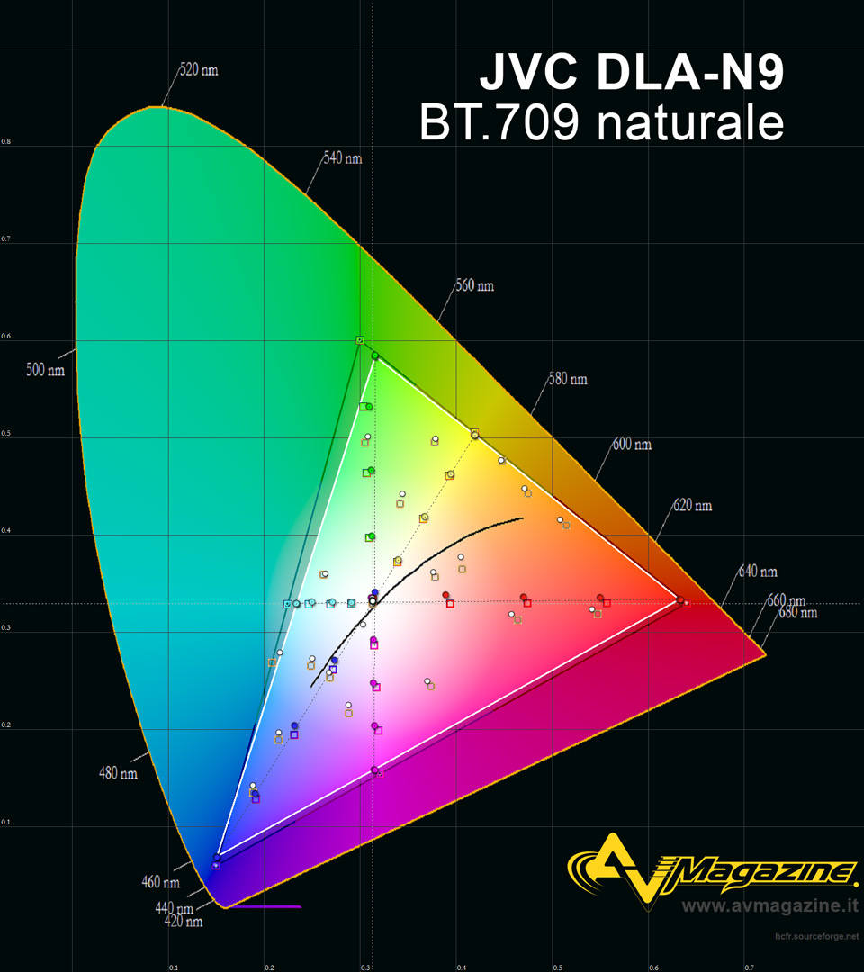 Come secondo atto, ho misurato i prinicipali parametri delle tre impostazioni predefinite, quindi rispettivamente i profili "Cinema", "Film" e "Naturale" che saranno quelli più utilizzati da chi non può o non ha voglia di effettuare una calibrazione sul proiettore. Vi ricordo che le prestazioni di bilanciamento del bianco e dei colori sono legate all'esemplare in questione e al numero di ore della lampada. Un esemplare diverso e con qualche centinaio di ore avrà certamente prestazioni leggermente differenti. Le curve del gamma sono quelle più svincolate da modello e ore di funzionamento e caratterizzano decisamente le tre impostazioni in esame, con il profilo "Naturale" che è senza dubbio in migliore e con prestazioni quasi coincidenti con il riferimento. L'analisi del bilanciamento del bianco certifica che l'impostazione predefinita "Film" è quasi disastrosa e da evitare. Il profilo "Cinema" invece è caratterizzato da ottime prestazioni ma con un bilanciamento che diventa un po' più "caldo" nelle basse luci ("tra il 15% e il 35%). Questo profilo è associato all'intervento del filtro colore per l'aumento delle dimensioni del gamut (come per il profilo "Film") e anche al bilanciamento del bianco predefinito "Xenon 2" che purtroppo non può essere richiamato nel profilo "Naturale". Il profilo "Naturale" offre eccellenti prestazioni dal 40% al 100% del segnale in ingresso ma modeste sulle basse luci per una dominante giallastra che però può essere corretta con relativa semplicità. Con l'analisi del gamut e dei punti di saturazione, appare ancora più chiaro che, come al solito per quanto riguarda la storia dei proiettori JVC, le impostazioni "Cinema" e "Film" sono assolutamente da evitare e non soltanto per le prestazioni sui valori del gamma appena analizzati ma soprattutto per gli evidenti errori di tinta e saturazione. Il profilo "Naturale" invece offre già prestazioni ottime ed è quindi anche un eccellente punto di partenza per una calibrazione manuale più approfondita.