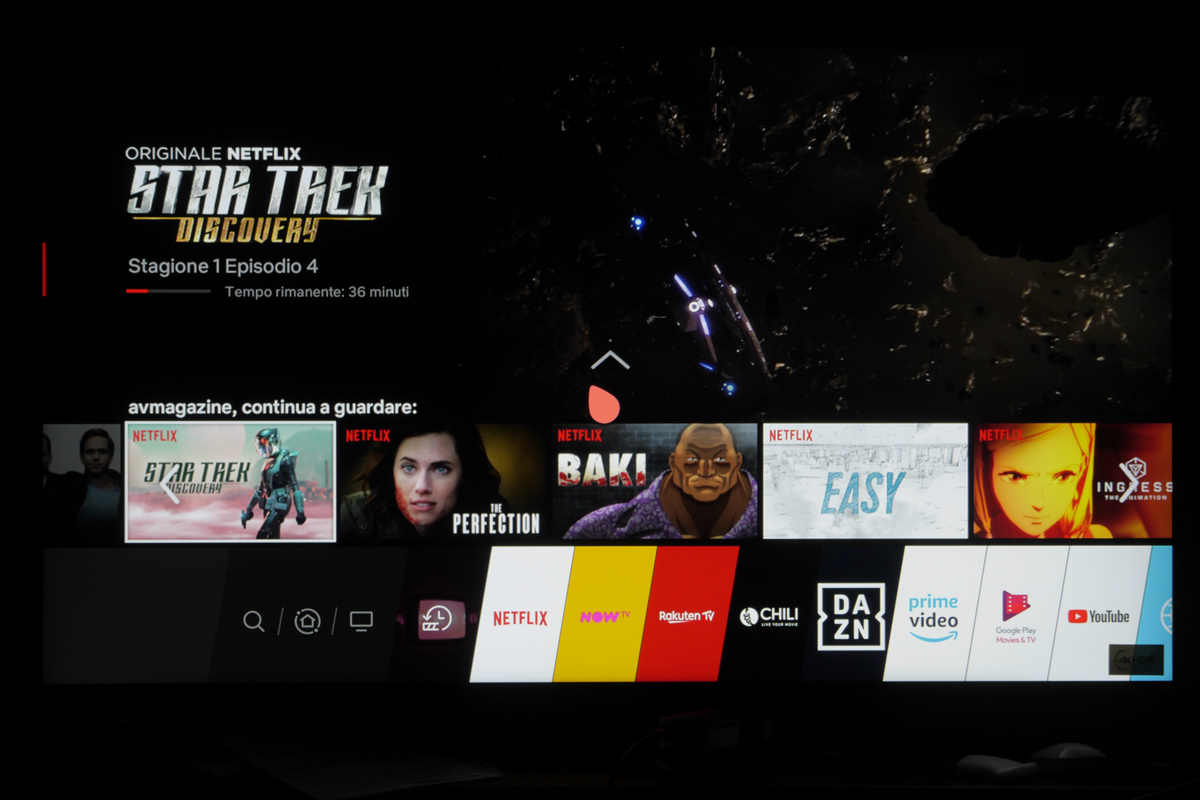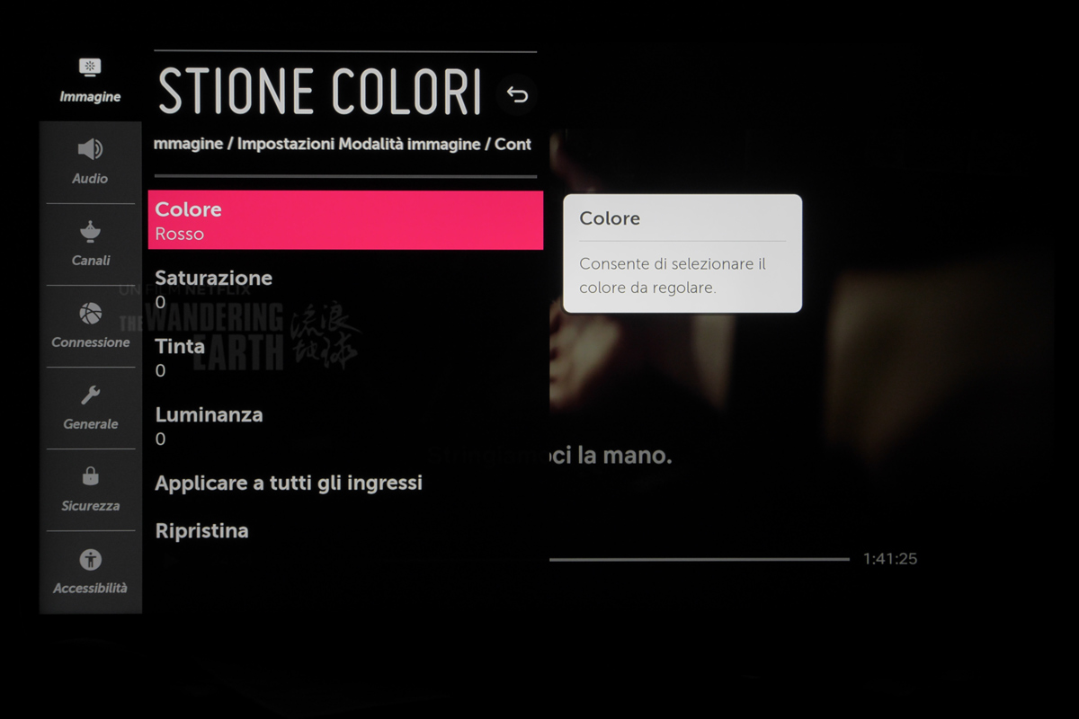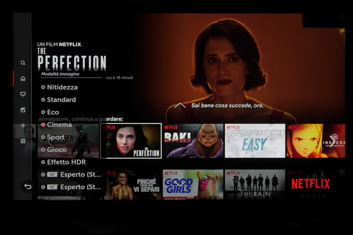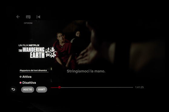 Con segnali HDR abbiamo saltato a piè pari le impostazioni predefinite con prestazioni inadeguate, concentrando l'attenzione su quelle più interessanti. Nel menu scompaiono le due voci "ISF" e si rimane con sole sei impostazioni predefinite, più che sufficienti per trovare un ottimo compromesso tra luminanza, colorimetria e rispetto della curva del gamma PQ. Tra i vari "filtri digitali", oltre che invitarvi a disabilitare praticamente tutto, segnaliamo invece le ottime prestazioni della "Mappatura dei toni dinamica" che approfondiremo appena più avanti. Le due impostazioni con prestazioni migliori sono quelle "Home Cinema" e "Cinema", quest'ultima con risultati molto vicini a quelli con segnali REC BT.709. Giova ricordare che con gamma PQ, la luminanza al 10% di intensità del segnale in ingresso vale quanto un 20% con gamma 2.2: ecco spiegate le deviazioni verso il "blu" al di sotto del 20%, più vicine al livello minimo di cui è capace un LCD IPS. I due grafici della curva di luminanza con ordinate logaritmiche e riferimento con clipping a 1.000 NIT in verde, ci consegnano un display sostanzialmente corretto, con il "bianco diffuso" (segnale in ingresso al 50%) che sfiora i 90 NIT. Il picco di luminanza vale poco meno di 500 NIT, con "roll-off" tra il 75% e 80% del segnale in ingresso. Variando i metadati con MaxCLL a 4.000 NIT, il TV varia correttamente il clipping, con roll-off oltre il 90%. Attivando invece gli algoritmi di intelligenza artificiale, viene attivato una sorta di "gamma dinamico" che dà più spazio alle modulazione dei primissimi gradini della scala dei grigi, riguadagnando quindi la dinamica che è inevitabilmente più indietro per tutti i limiti della tecnologia LCD IPS. I due gamut, catturati per le relative impostazioni predefinite fin qui analizzate, hanno dimensioni più contenute rispetto ai limiti dello spazio colore DCI-P3 ma generalmente più estese (specialmente su blu e verde) rispetto ai TV con tecnologia OLED. La modalità home cinema non convince ed è una diretta conseguenza del bilanciamento del bianco che vira verso il blu. Nella modalità "cinema" invece, la precisione di tinta, saturazione e livello dei colori primari e secondari è encomiabile ed è uno degli aspetti più interessanti di questo TV. Con la visione di contenuti in HDR10 di riferimento in modalità "Cinema" (Sicario, Soldado, Animali Fantastici 2, Aquaman), ho apprezzato una buona qualità generale, con una precisa riproduzione del colore e con una ricchezza di sfumature che non riesce ad esprimersi al massimo sulle basse luci, a causa soprattutto di un rapporto di contrasto nativo che è pur sempre ingabbiato all'interno dei limiti della tecnologia IPS. D'altra parte, sono rimasto piacevolmente sorpreso dall'efficienza della modalità "Mappatura dei toni dinamica" che misura con precisione la composizione delle immagini e riesce a modulare una curva del gamma che non snatura la dinamica dei contenuti dati in pasto al TV ma che riesce in effetti a dare un bel po' più di respiro alle informazioni sulle basse luci. Nelle immagini qui in alto, una scena da "The Wandering Earth" (Netflix, HDR) al minuto 24... In più, con scene molto scure con elevata dinamica, bisogna fare i conti con le poche zone verticali di retroilluminazione (sono probabilmente 8 anche se con sole 6 combinazioni, ovvero a gruppi di tre) che nelle fasi finali di "Sicario", con i sottotitoli "hard coded" che creano parecchi problemi, innalzando il livello del nero a livelli imbarazzanti. Quando invece ci sono contenuti luminosi, il gap rispetto ai TV con tecnologia "LCD VA" è praticamente invisibile e si apprezzano di più altri aspetti, come l'eccellente uniformità e la buona rapidità di risposta, utilissima anche per i videogiocatori. In buona sostanza, siamo davanti ad un TV che dà il meglio di sè sicuramente con segnali SDR ma che non disdegna segnali video ad elevata dinamica e che è caratterizzato da un gamut con dimensioni più generose rispetto ad altri display con tecnologia LCD e retro-illuminazione tradizionale. Il prezzo suggerito al pubblico, pari a 1.199,00 Euro IVA inclusa, è sicuramente elevato in assoluto, anche in considerazione del prezzo di alcuni display OLED dello stesso produttore lanciati lo scorso anno che oggi hanno costi ben inferiori ai 1.500 Euro. D'altra parte, il TV in oggetto è già disponibile presso alcuni market online a meno di 900 Euro, con alcuni rivenditori affidabili che hanno fissato il prezzo a poco più di 800 Euro. La pagella secondo Emidio Frattaroli: voto finale 7,3