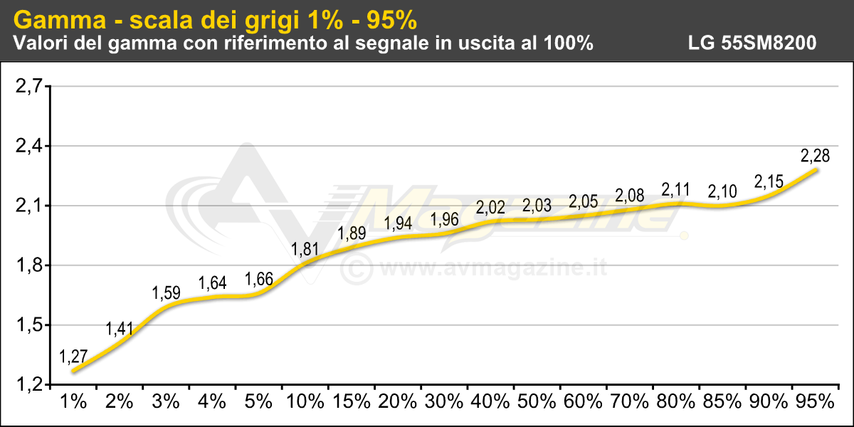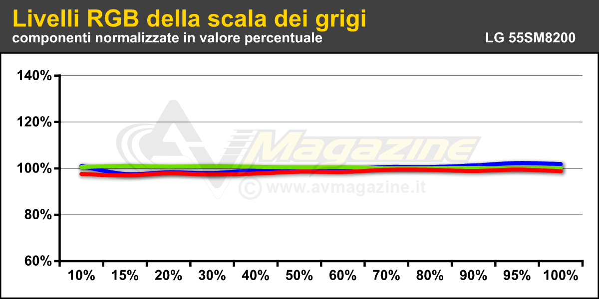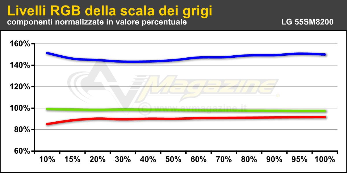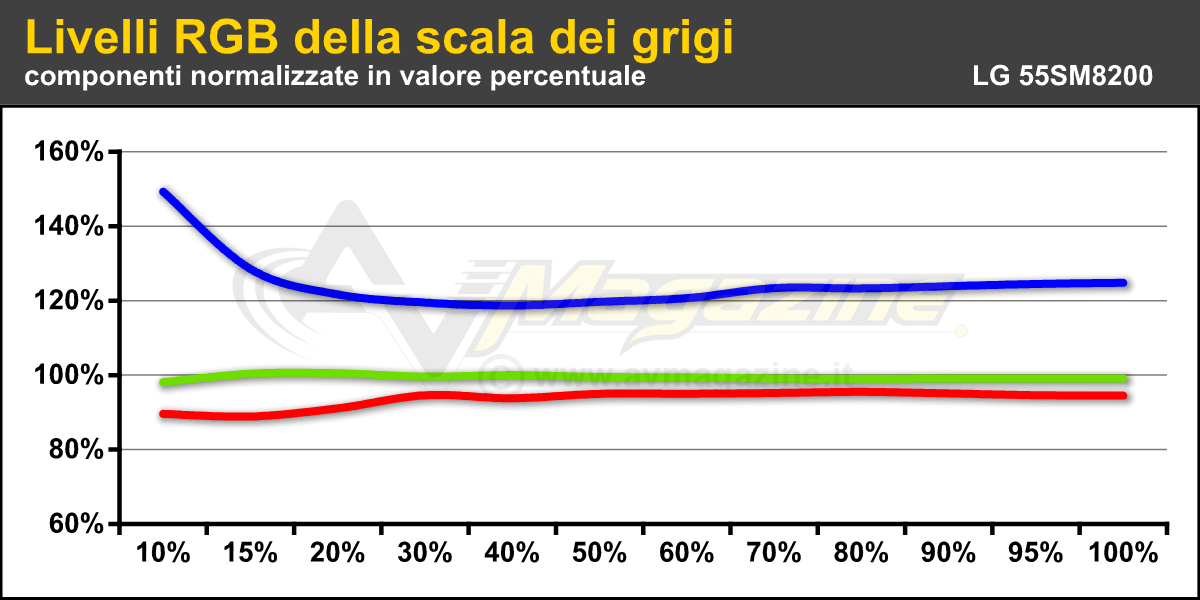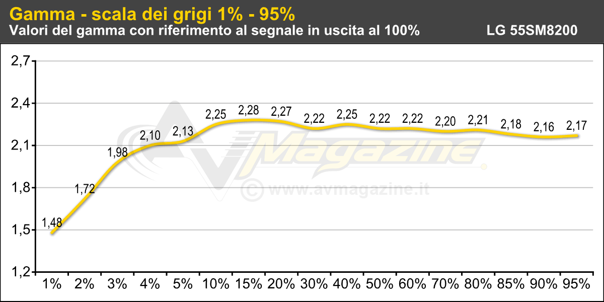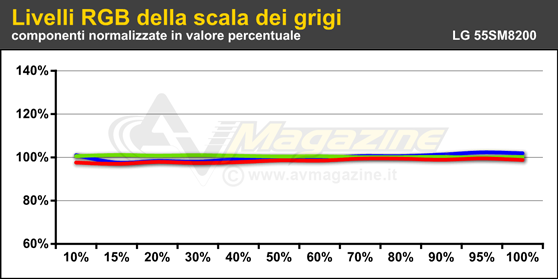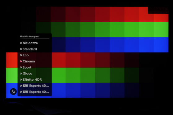 Il menu di impostazione delle immagini è quello "classico" dei TV LG delle ultime generazioni ed ha ben 9 differenti impostazioni predefinite, molte delle quali personalizzabili in tutte le impostazioni, scegliendo ovviamente il menu avanzato. In particolare, segnaliamo la possibilità di calibrare il bilanciamento del bianco fino a 22 punti e la presenza di un Color Management System a 6 assi (RGBYCM) con calibrazione di tinta, saturazione e livello. Consigliamo comunque l'impostazione predefinita "cinema", invitando a disabilitare tutti i vari "filtri digitali" che sono molto aggressivi e rendono le immagini innaturali. Le prestazioni del bilanciamento del bianco nella modalità "standard" sono, come al solito per la quasi totalità di TV del settore consumer, decisamente mediocri, con dominanti così fredde da aver dovuto spostare i limiti del nostro grafico delle componenti RGB. Nella modalità "cinema" le cose vanno decisamente bene, anzi benissimo, così tanto da non dover richiedere una calibrazione manuale. La curva del gamma nella modalità standard è molto vicina al riferimento di 2.2 e i primissimi gradini fino al 4% sono limitati dal rapporto di contrasto nativo che vale appena 1.000:1. Nella modalità cinema i valori del gamma sono generalmente più bassi, situazione che - visto il rapporto di contrasto molto contenuto - lascia "più spazio" per la riproduzione dei primissimi gradini della scala dei grigi, quindi il risultato è sensibilmente superiore. Le dimensioni del gamut sono leggermente più grandi rispetto al REC BT.709 ma il vero problema è cosa succede ai colori secondari e alle tinte a saturazione intermedia nella modalità "standard", viziata - come abbiamo visto più in alto - da un bilanciamento del bianco decisamente "bluastro". Nella modalità "cinema" invece le prestazioni rasentano la perfezione per buona parte dei colori primari e secondari. In buona sostanza, selezionando la modalità "cinema", il TV ha prestazioni ottime. In modalità REC BT.709 abbiamo anche verificato il tempo di lag, ovvero quanti millisecondi passano tra l'ingresso del segnale e la sua effettiva riproduzione, utilizzando come generatore il piccolo "input lag tester" di Leo Bodnar, con segnale in ingresso 1080p e 60hz di frequenza di quadro, con risultati a dir poco eccellenti: mai visti tempi così ridotti su un TV: le prime linee di scansione arrivano dopo appena 5,3 millisecondi, mentre le linee che sono più o meno al centro dell'immagine arrivano dopo 13,5 millisecondi.