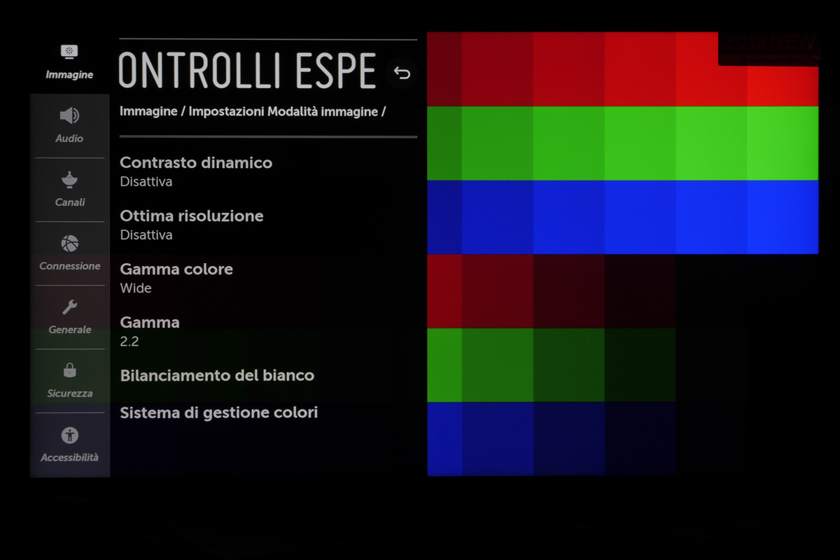 Il mercato dei TV in questi ultimi anni sta subendo modifiche sostanziali. La fascia più alta è praticamente dominata dalle tecnologie OLED ed LCD con Quantum Dots, con modelli che, per la diagonale da 55", hanno un prezzo suggerito al pubblico che supera in alcuni casi 2.500 Euro IVA inclusa. Il mercato "main-stream" è ancora saldamente in mano alla tecnologia LCD e alle due declinazioni IPS (In Plane Switching) e VA (Vertical Alignment) con caratteristiche leggermente differenti ma con cui vengono sfornati prodotti con prezzi molto contenuti. Tra la fascia più economica e quella più alta, c'è una zona non ben definita, ancora monopolio della tecnologia LCD ma con caratteristiche che di solito ritroviamo solo nei TV di fascia più elevata, come ad esempio unità di elaborazione potenti e veloci, funzioni e algoritmi di miglioramento delle immagini di ultima generazione, qualità video che non fa troppo rimpiangere quella dei primi della classe. la serieSM8200 NanoCell di LG Electronics si inserisce proprio in questa fetta di mercato: è basata su tecnologia LCD IPS, ha una buona potenza luminosa ed ha un prezzo suggerito al pubblico che vale meno della metà rispetto ad un modello con tecnologia OLED oppure Quantum Dot. L'aspetto è quello di un TV di fascia alta, con cornice sottile, profondità estremamente ridotta, pannello posteriore pulito e plastiche di qualità elevata. Il piedistallo ha disegno e finiture molto interessanti: peccato che l'aggancio al TV renda la struttura un po' troppo elastica, con il pannello che traballa per qualche secondo quando si cerca di spostarlo. Questo però non ha effetti sulla stabilità che invece è perfetta. Per aumentare le dimensioni del gamut colore, invece che usare costose soluzioni con "quantum dots" oppure LED bianchi con fosfori rossi e verdi, LG Electronic ha scelto una unità di retroilluminazione con LED bianchi con miscela di fosfori gialli, la soluzione più economica sul mercato ma con gamut più limitato (di solito non supera l'80% del DCI-P3). Nel pannello LG, oltre al tradizionale filtro colore RGB per ogni sub-pixel, stavolta c'è un ulteriore filtro di "notch" che va a togliere il colore "giallo" con picco di frequenze a circa 595 nanometri. Il nuovo nano-filtro colore funziona molto bene anche fuori asse, con gamut che mantiene le sue dimensioni anche ad angolazioni importanti. VI anticipo che, nelle migliori condizioni, viene raggiunto il 92% del gamut DCI-P3. Magari si potrebbe discutere sulla possibilità di parlare di "nano-particelle" ma la bontà della tecnologia è fuori discussione. Per chi volesse approfondire, segnalo questo articolo dello scorso anno su Display Daily. Il pannello posteriore è ricco di ingressi, concentrati in due piccole zone. Dei quattro ingressi HDMI, tutti di tipo 2.1 con HDCP 2.2, i primi due sono ad accesso laterale, nella stessa area che ospita anche la CAM CI+ fino a REV 1.4 e una porta USB. Tutti gli altri ingressi sono ad accesso posteriore, situazione che potrebbe creare qualche difficoltà per il montaggio a parete. Il sistema operativo è il webOS 4.5, rapido e affidabile, con app ad avvio veloce e stabilità invidiabile. Il menu è ben articolato ed è praticamente lo stesso di tutti i TV LG di fascia alta degli ultimi anni, con impostazioni avanzate per la calibrazione delle immagini, menu di calibrazione ISF e tante voci che faranno la felicità degli smanettoni. Caratteristiche dichiarate: