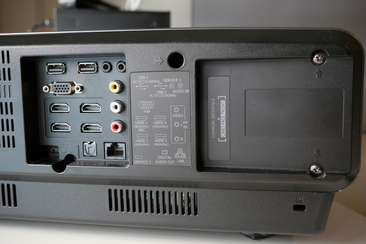 La dotazione di connessioni è ancora più ricca rispetto a quella di un moderno televisore di fascia alta. C'è l'ingresso per il cavo d'antenna satellitare e quello per l'antenna terrestre, oltre ad uno slot per Common Interface compatibile 1.4+, perfetto anche per tivusat 4K. I 4 ingressi HDMI sono tutti compatibili con segnali a 18 GBps (4K 60p HDR) ed uno di questi è di tipo ARC; c'è anche un ingresso CVBS con audio stereo RCA e un ingresso RGB su connettore D-sub 15 poli (alias "VGA"). Completa la dotazione una porta LAN, l'uscita audio ottica S/PDIF, un ingresso audio stereo su porta minijack e due porte USB 2.0 con corrente a 0,5 Ah. Il sistema audio integrato prevede un doppio "due vie" in configurazione stereofonica da 20W per canale e la possibilità di funzionamento "solo audio", come uno smart-speaker.