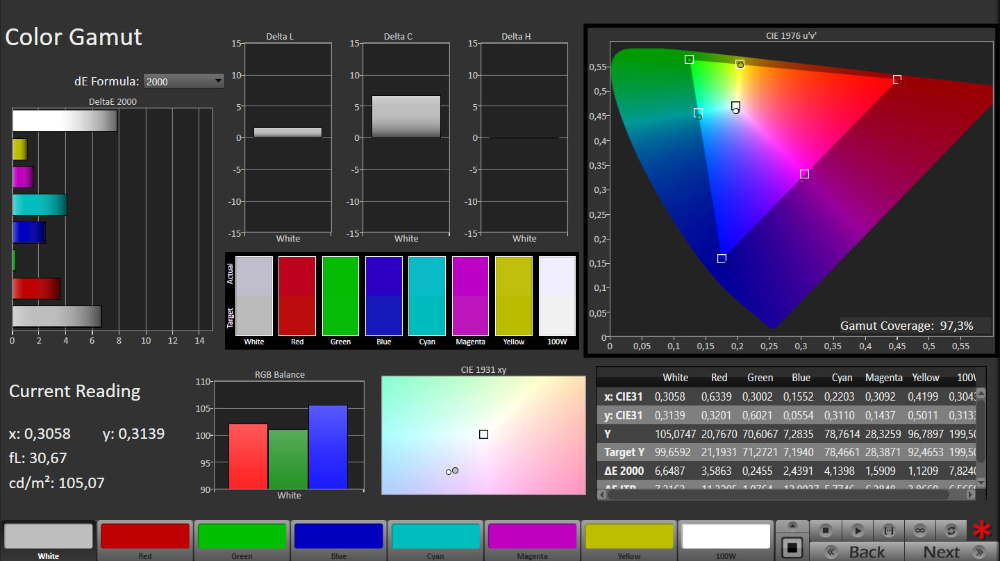 I piccoli aggiustamenti che ho apportato sono comunque stati sufficienti per ottenere miglioramenti, soprattutto sui colori: nel color checker i il DeltaE è sceso a 4,15 come massimo e a 1,68 in media. Concludo con qualche cenno sull’uniformità: non ho eseguito misure accurate ma a occhio l’esemplare che ho visionato mi è sembrato piuttosto buono, sia sul bianco sia sulle basse luci. Anche in condizioni di utilizzo reale la presenza di effetti indesiderati come il “dirty screen effect” (strisce verticali che si presentano come una sorta di velo che sporca l’immagine, sono visibili soprattutto nelle immagini in movimento).