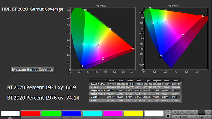 Il picco di luminanza è superiore a quello dichiarato: sono circa 950 nit col bianco in finestra al 10%, un valore che sale a circa 1.000 al 25%. A pieno schermo si arriva invece a 520 nit. La resa dei colori in HDR è più che discreta: non c’è una fedeltà altissima con le impostazioni di fabbrica ma il TV si difende bene, con un DeltaE che mediamente spazia tra 2,4 e 3 e un massimo che arriva a circa 6,4. La copertura dello spazio colore BT.2020 raggiunge il 66,9% xy e il 74,14% uv, quella del DCI-P3 è invece pari al 90,5% xy e al 93,97% uv.
