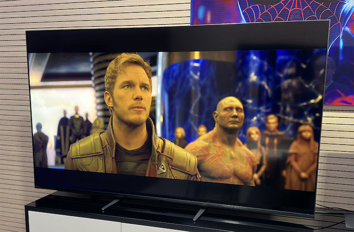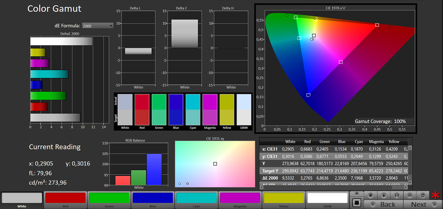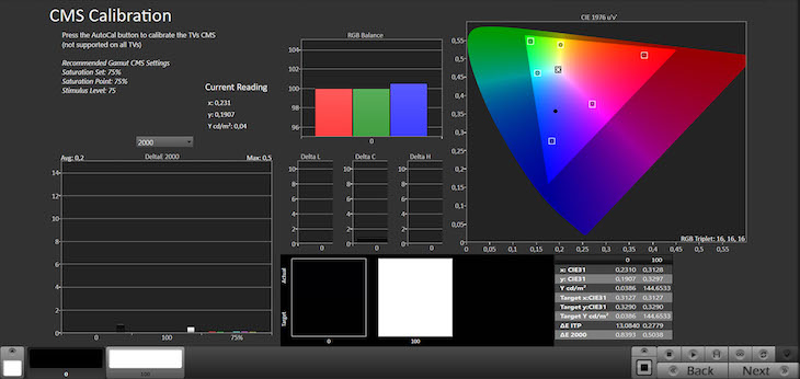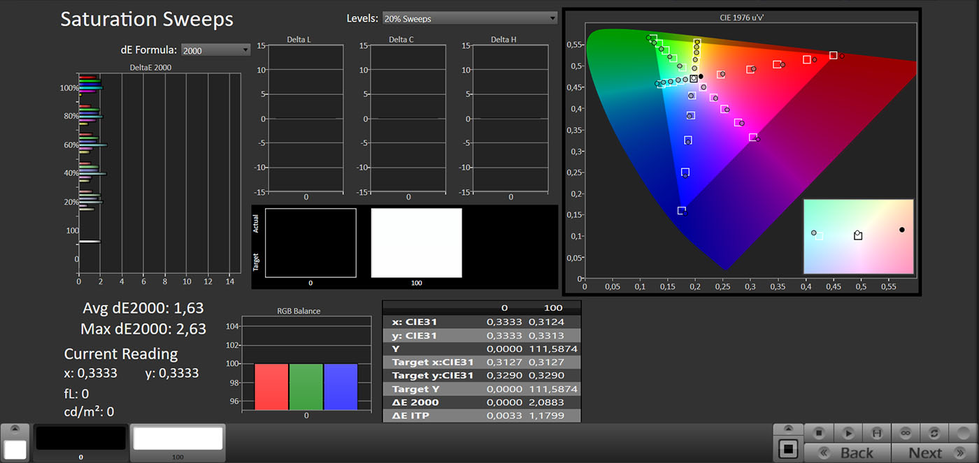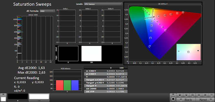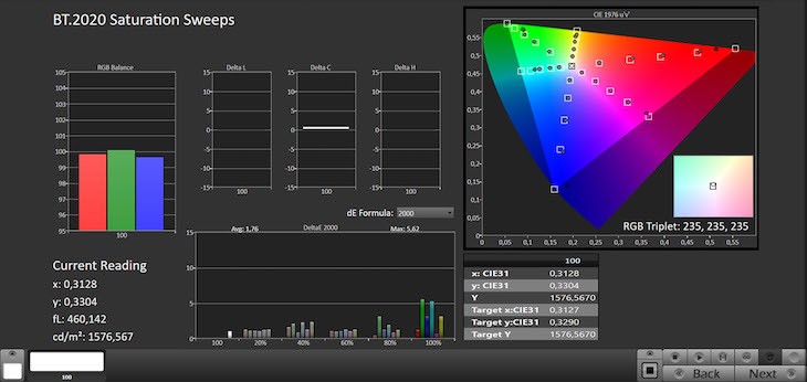 La luminanza cala un po’: siamo intorno ai 1.800 nit. Il punto forte resta la riproduzione dei colori, che sono quasi tutti molto fedeli. Anche tenendo conto degli errori di luminanza, il DeltaE rimane sotto il 3, con una media ben inferiore a 2. L’unica eccezione è costituita dai vertici del gamut BT.2020, dove la soglia si alza anche dopo la calibrazione: le regolazioni non possono ovviamente aumentarne la copertura. Il TV si ferma al 72,42% xy e al 79,36% uv, mentre il DCI-P3 raggiunge il 93,35% xy e il 96,65% uv.