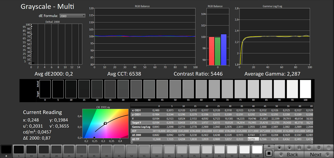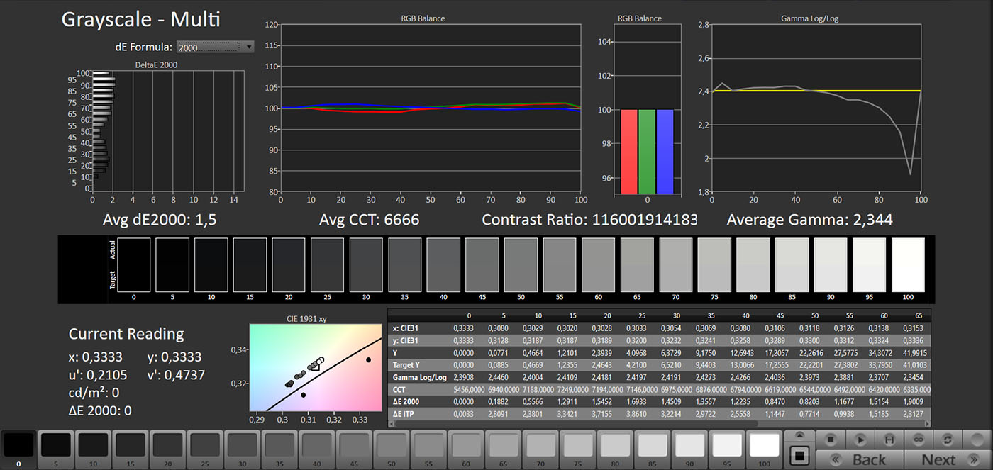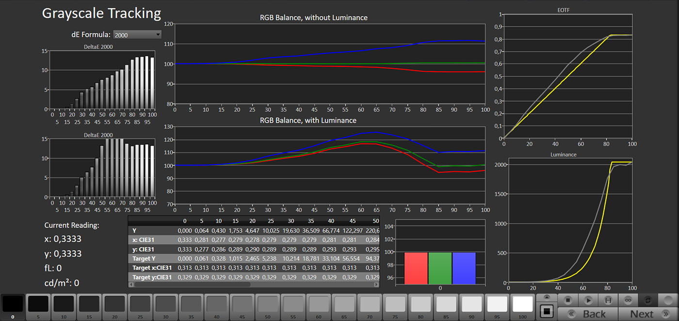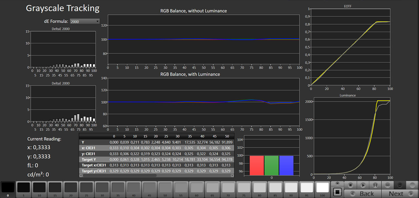 La modalità Professionale è praticamente l’equivalente della Filmmaker Mode, che però sui TV Sony non è presente. L’approccio è lo stesso e il punto di bianco è praticamente perfetto. l’eccesso di blu sulla scala dei grigi scompare, con un DeltaE medio di 1,5, ben al di sotto della soglia percepibile dall’occhio umano (che corrisponde a 3). La linearità è buona sulle basse luci (le parti più scure), ma tende a schiarire le alte, specialmente tra il 90% e il 95%, dove il gamma si avvicina a 2. Non si tratta di un limite del pannello, ma del funzionamento del local dimming nella sua impostazione di base.