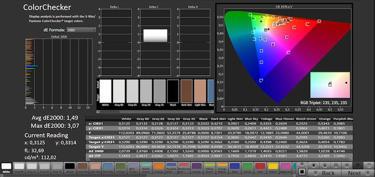 Nella modalità Professionale anche in HDR i colori sono molto buoni, con due grafici di color-checker quasi esemplari: l’errore massimo supera leggermente 3 solo nei toni più saturi del BT.2020.