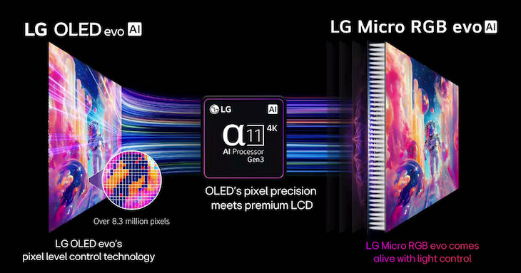 La tecnologia Micro RGBNel 2026 debutta la tecnologia Micro RGB, basata su LCD dotati di una retroilluminazione composta da triplette di LED: uno rosso, uno verde e uno blu. Le differenze rispetto ai Mini LED tradizionali sono due: la purezza dei colori e la possibilità di pilotare separatamente le componenti RGB della retroilluminazione. I Micro RGB generano le componenti cromatiche primarie direttamente a livello della sorgente luminosa, senza elementi intermedi a valle, come fosfori, Quantum Dot o filtri colore, utilizzati per espandere la gamma cromatica. Questa caratteristica consente di coprire completamente anche gli spazi colore più estesi: LG dichiara il 100% di copertura per Adobe RGB, DCI-P3 e BT.2020. Il controllo della retroilluminazione evolve oltre il local dimming tradizionale: entra in gioco il 2D color dimming, che modula non solo la luminanza, cioè la quantità di luce emessa, ma anche il colore, gestendo separatamente le componenti RGB. A supportare questa configurazione più complessa interviene il processore Alpha 11 di terza generazione. La nuova retroilluminazione richiede infatti un controllo molto più sofisticato: i LED non sono più suddivisi solo in zone, ma necessitano di una gestione individuale anche per le componenti cromatiche. LG ha scelto di utilizzare lo stesso chip degli OLED, sfruttando l’esperienza maturata nella gestione di oltre otto milioni di pixel autoilluminanti. Nasce così la tecnologia Micro Dimming Ultra, che equipaggia i Micro RGB evo AI, cioè la serie di fascia più alta. LG parla di oltre 1.000 zone indipendenti, un valore che andrà contestualizzato per capire se includa anche la gestione separata delle componenti RGB; in tal caso, il numero di zone di local dimming tradizionale sarebbe pari a un terzo.