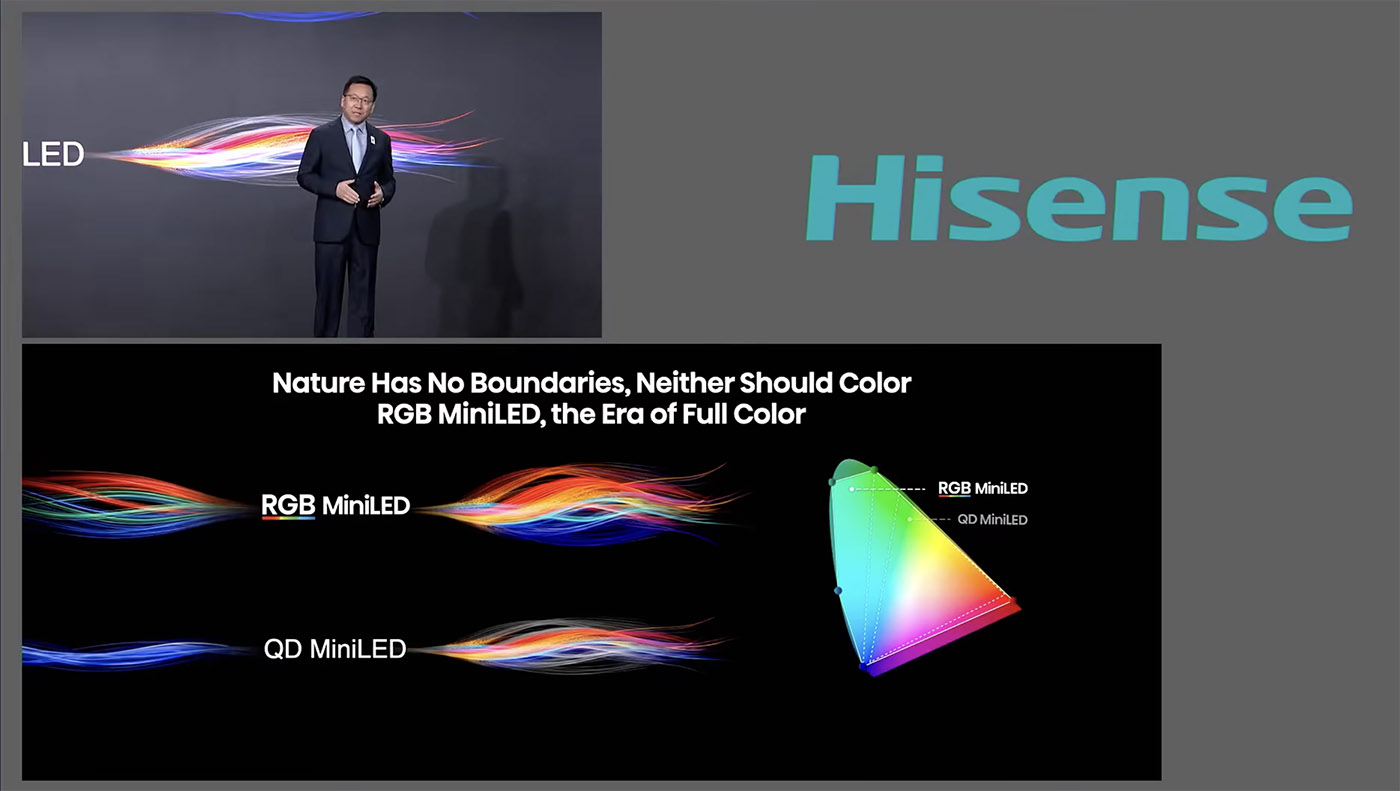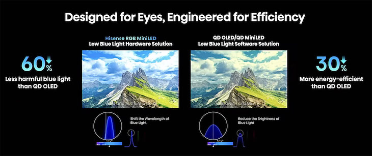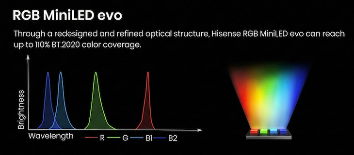 La retroilluminazione utilizza i nuovi chip RGB Mini LED 2.0, all’interno dei quali sono integrati non più tre ma quattro diodi. A rosso, verde e blu si aggiunge un quarto colore denominato Sky Blue, una tonalità prossima al ciano. Hisense definisce questa soluzione Four-Primary-Color Backlight e le attribuisce tre benefici principali.