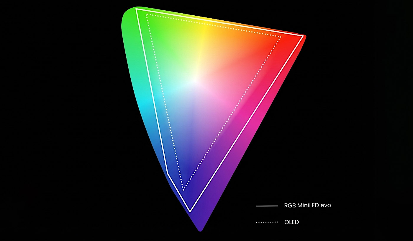 L’aggiunta del quarto Mini LED modifica la distribuzione spettrale della luce emessa, introducendo una seconda componente vicina al blu. Il risultato è un’ulteriore estensione della copertura cromatica, che secondo Hisense arriva a superare persino lo spazio colore BT.2020. I Mini LED RGB evo lo coprono al 110% e e cambiano anche la forma del grafico, che non è più triangolare ma assume la forma di un poligono a quattro lati. A cosa serve una copertura che eccede perfino lo standard più ampio? Hisense l’ha spiegato chiaramente: l’obiettivo è coprire l’intera gamma di colori che l’occhio umano può percepire, andando oltre gli spazi colore attualmente in uso. È un approccio coerente con con la direzione intrapresa dai formati HDR di nuova generazione.