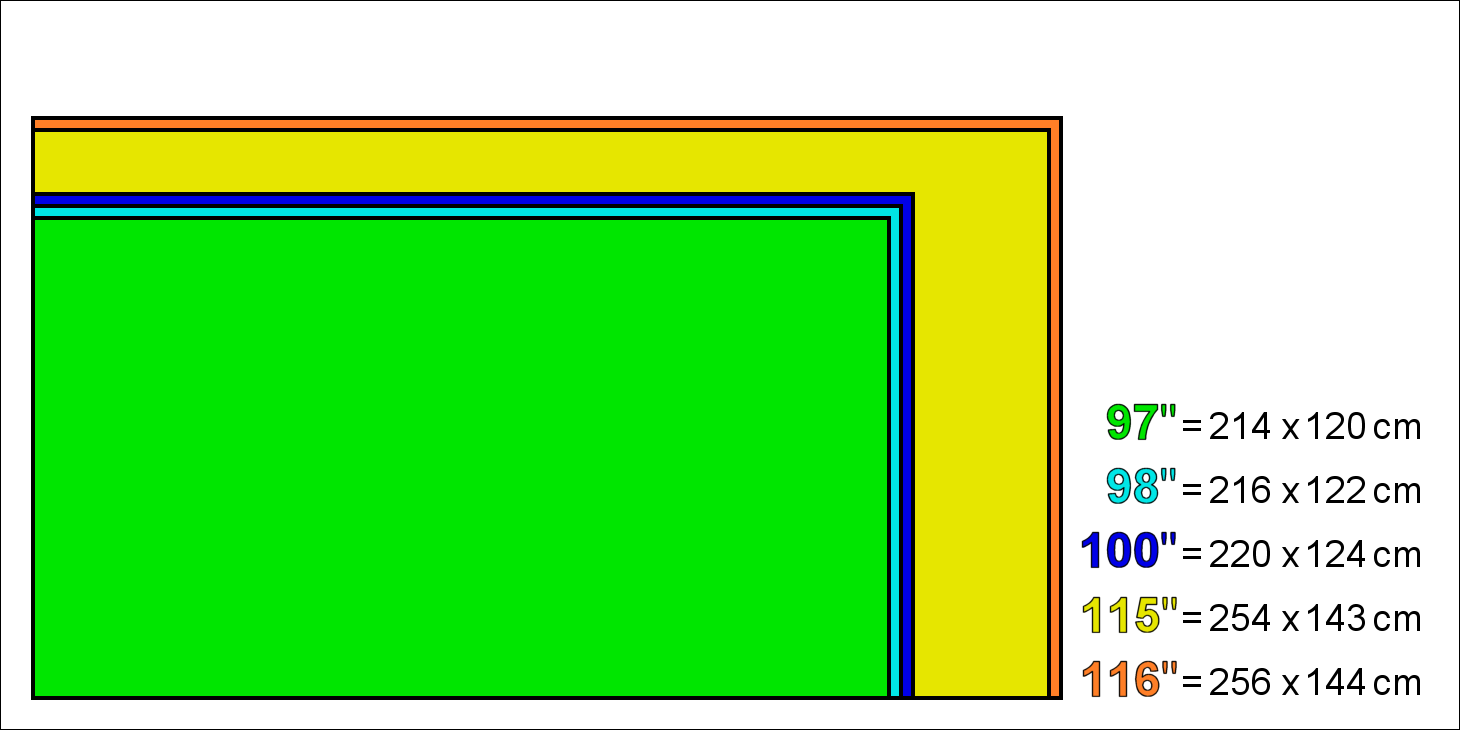 I TV extra-large non sono più una rarità e nemmeno esclusivo appannaggio di pochi facoltosi. Nel corso degli ultimi anni, il mercato si è ampliato molto rapidamente, andando a occupare un segmento che in precedenza era esclusivo appannaggio dei proiettori. A spingere in questa direzione sono stati soprattutto i marchi cinesi come TCL e Hisense, forti dell’integrazione verticale che garantisce una notevole capacità produttiva, anche su questi tagli. L’offerta è oggi piuttosto vasta e variegata: si parte da meno di 2.000 euro e si arriva fino a oltre 50.000 euro, per i prodotti che uniscono la maestosità con materiali e design di lusso. Per aiutare i lettori a districarsi tra tutti i modelli in commercio, abbiamo realizzato questa piccola guida, che racchiude tutti i TV dai 97 e fino a 116 pollici con tutte le principali caratteristiche. Nello schema qui in alto riassumiamo le proporzioni dei 5 tagli disponibili tra tutti i 28 modelli attualmente sul mercato con le misure in centimetri delle immagini per le due dimensioni principali: base e altezza. Le differenze tra 97", 98" e 100" sono minime come quelle tra 115" e 116". Attenzione che le dimensioni massime del TV sono ancora superiori rispetto alla diagonale delle immagini, per tacer dell'imballo. Il TV più grande è il 116" Hisense UXQ (2631 x 1489 x 40 mm) con peso netto di 109 kg. Se consideriamo l'imballo al primo posto c'è il 115" TCL C7K protetto da una cassa di legno con dimensioni di 2895 x 355 x 1840 mm e peso complessivo dell'imballo di quasi 230 kg!