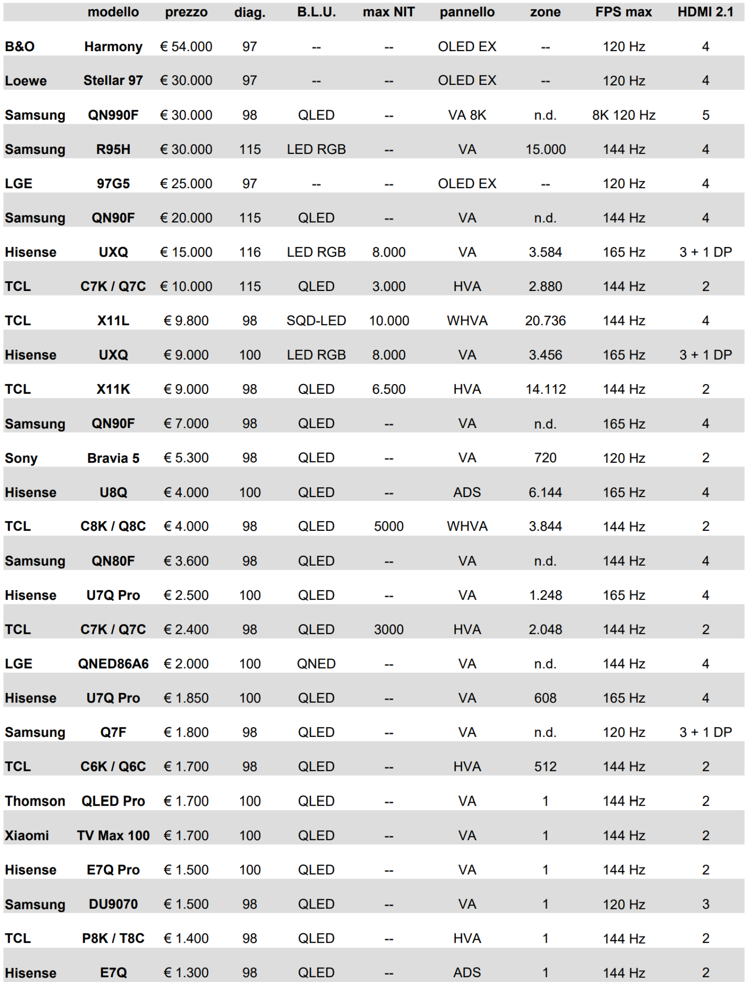 Chiudiamo con una tabella riepilogativa con tutte le caratteristiche principali, tra cui la tecnologia del pannello, quella della retro-illuminazione (Back Light Unit), il picco di luminanza ove dichiarato, il numero di zone, il numero di ingressi HDMI 2.1 (in un paio di modelli c'è anche il DisplayPort via USB-C), la massima frequenza di quadro e ovviamente il prezzo suggerito al pubblico.