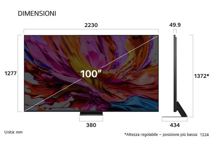 Oltre alle caratteristiche legate alle tecnologie utilizzate, alle prestazioni pure e alla qualità generale, quando si parla di TV dai 97" in su bisogna fare molta attenzione a peso e dimensioni. Nella tabella che segue abbiamo inserito le dimensioni principali del pannello, senza base o piedistallo, arrotondate senza decimali. Quindi controllate sempre le caratteristiche tecniche sul sito del produttore, anche per scoprire le dimensioni dell'imballo: il link è nella scheda del prodotto che abbiamo preparato.