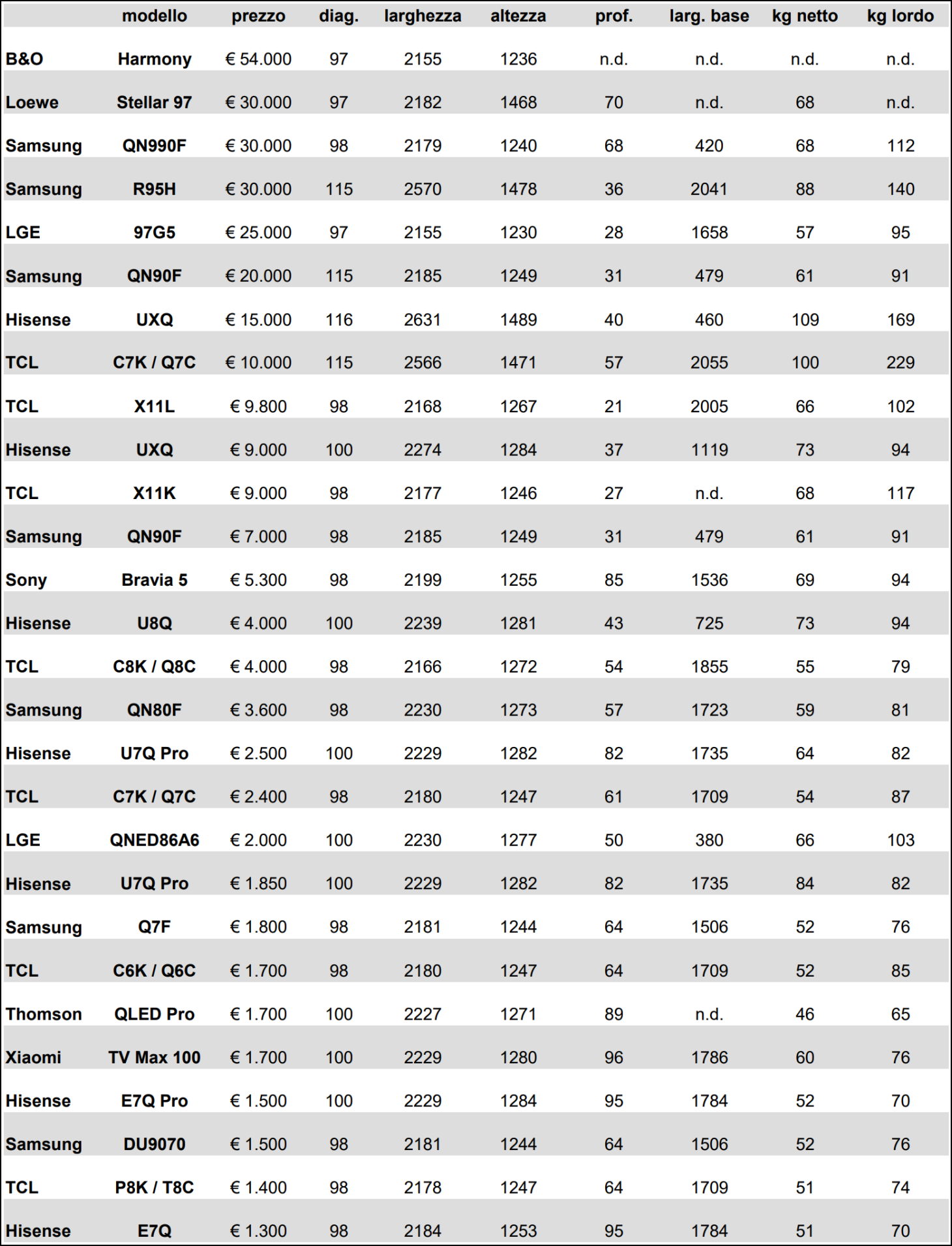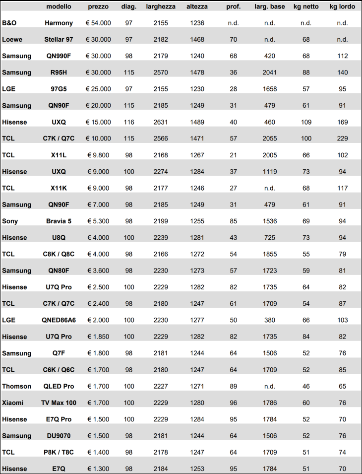 Tra i TV LCD c'è da considerare anche la retro-illuminazione. Due le informazioni importanti da verificare. Prima di tutto il tipo di tecnologia. Nella maggior parte dei casi si tratta di LED blu associati a varie miscele di fosfori e/o con quantum dots. Per la fascia più alta ci sono i LED RGB. L'altro aspetto è il numero di zone. I TV più economici non hanno local dimming (una sola zona). I più costosi hanno anche 20.000 zone o più. Purtroppo numero di zone e massima luminanza non sono sempre dichiarate. Tabella delle caratteristicheEcco quindi la prima tabella riepilogativa con tutte le caratteristiche principali, tra cui la tecnologia del pannello, quella della retro-illuminazione (Back Light Unit), il picco di luminanza ove dichiarato, il numero di zone, il numero di ingressi HDMI 2.1 (in un paio di modelli c'è anche il DisplayPort via USB-C), la massima frequenza di quadro e ovviamente il prezzo suggerito al pubblico. Tabella pesi e dimensioni