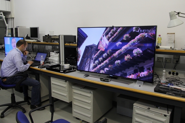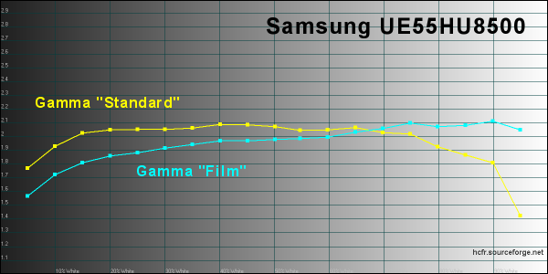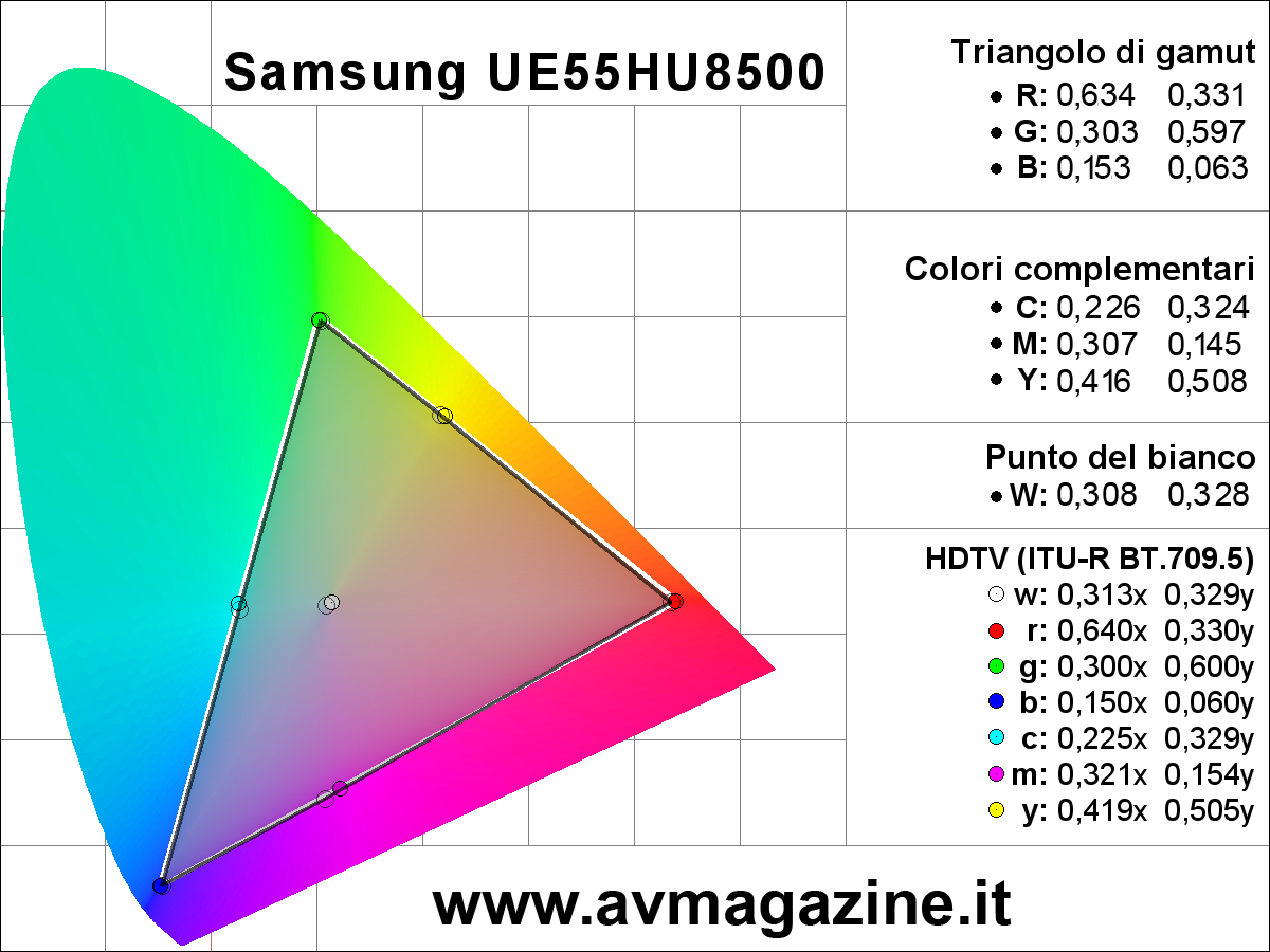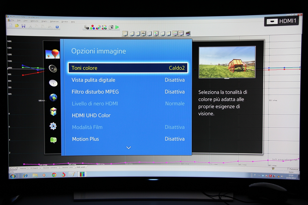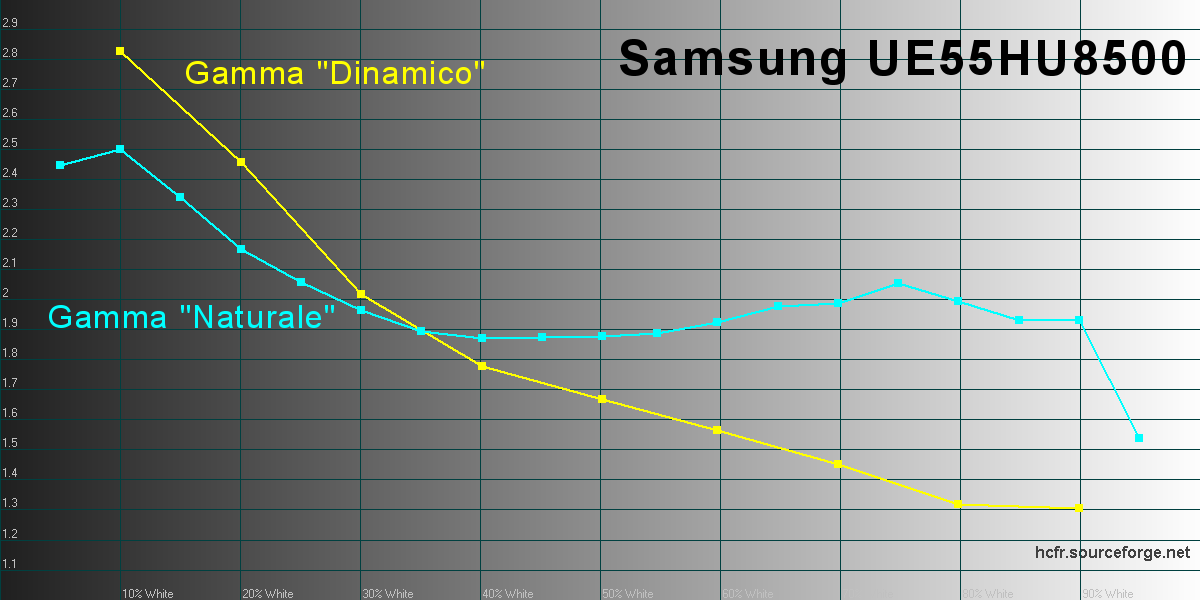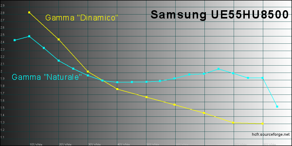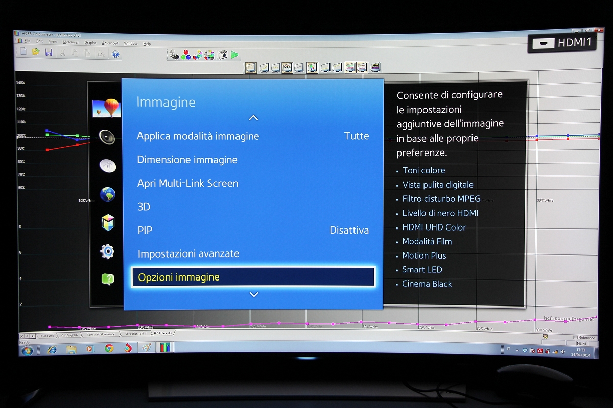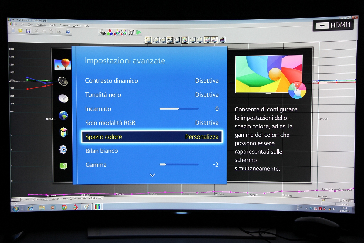 La nuova gamma TV Samsung Ultra HD è composta da 6 diverse linee di TV, organizzate in ben 16 diversi modelli, con diagonali comprese tra i 40" della linea HU6900 e gli 85" della linea HU7500 e del prestigioso modello S9. Tra queste serie ce ne sono soltanto due con pannelli curvi: la linea HU8500 con tre modelli e con diagonali rispettivamente di 78", 65" e 55". Poi c'è anche la linea HU8200, con finiture e caratteristiche molto simili ma con due soli tagli disponibili: 65" e 55". Il modello che ho testato, il nuovo Samsung UE55HU8500, si posiziona in cima all'attuale gamma TV, è dotato dell'unità di elaborazione più potente e quindi può contare sulle funzioni "smart" più avanzate. L'estetica è certamente appagante: la curvatura del display è ben avvertibile ed è sottolineata anche dalla base d'appoggio, con una finitura molto elegante che ricorda l'alluminio spazzolato, la stessa scelta per il pannello posteriore, davvero molto elegante. Tutte le connessioni (4 HDMI, 3USB, LAN, SCART, slot CI+, prese RF, segnali component, audio et cetera) sono tutte integrate in un piccolo box, connesso al TV mediante un singolo cavo. Le porte HDMI sono già compatibili "2.0" e 60p mentre l'elettronica è in grado di decodificare contenuti 4K compressi in HEVC. Qualora dovesse essere necessario, la compatibilità con alcuni degli standard futuri è garantita proprio dalla sostituzione di questo box con uno più moderno. Il menu è ben organizzato, con grafica molto leggibile e moderna e veloce. In questo primo veloce incontro ho tralasciato l'analisi delle funzioni "smart" che approfondirò sicuramente in altra occasione e ho preferito utilizzare i pochi minuti a disposizione per verificare la qualità d'immagine, a partire dalle funzioni presenti nel menu, fornendo indicazioni più precise direttamente nei due paragrafi dedicati alla misura delle prestazioni. Il test è avvenuto all'interno del laboratorio della sede di Samsung Italia grazie alla preziosa disponibilità del personale italiano che mi ha concesso quasi un paio d'ore per tutte le analisi del caso con parte della strumentazione portatile, ovvero con x-rite i1 Pro e x-rite i1 Display Pro. Pagina 3 - LAB: misure in modalità default