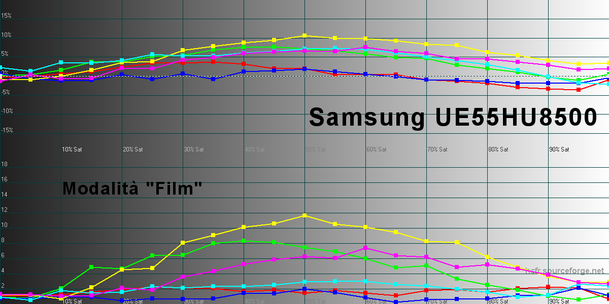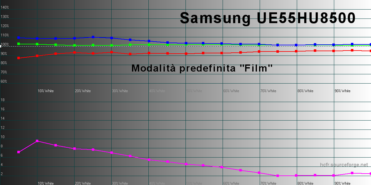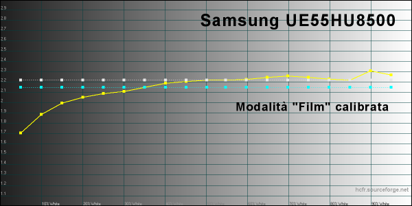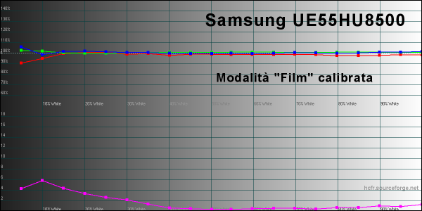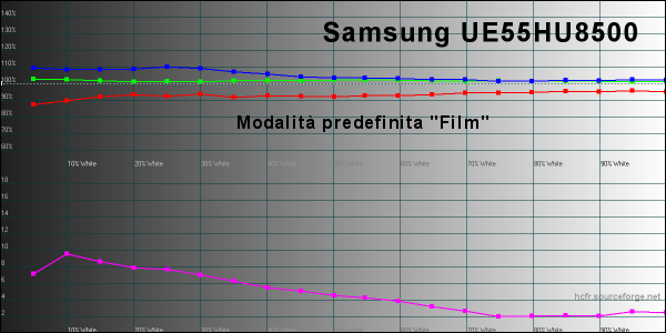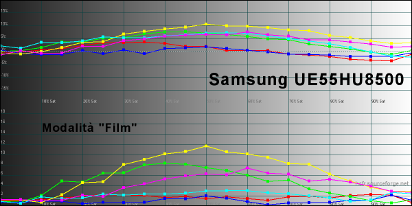 Iniziamo dall'analisi delle curve del gamma e dei valori di luminanza massima che, con impostazioni predefinite in modalità "Dinamica", arriva a 341 candele su metro quadrato ed è un valore leggermente inferiore rispetto ad altri TV a risoluzione Ultra HD 4K che ho misurato recentemente. In ogni modo, la modalità dinamica è caratterizzata da una qualità video generale piuttosto bassa, con bilanciamento del bianco che definire anche solo "bilanciamento" è un eufemismo, valori del gamma molto bassi sulle alte luci e elevati su quelle più basse e colori complementari molto lontani dal riferimento. Insomma: un mezzo disastro. Le impostazioni predefinite "Naturale" vanno solo leggermente meglio per i parametri del gamma. Bilanciamento del bianco e colori sono sempre da dimenticare. Con la modalità "Standard" la curva del gamma va nettamente meglio ma sulle alte luci perde parecchi punti mentre sul bilanciamento del bianco e colori siamo sempre lontani.Al contrario, selezionando la modalità "Film" ci si avvicina notevolmente al riferimento sotto molti punti di vista.; in questo caso però la luminanza scende fino a 272 candele su metro quadrato: un valore più che sufficiente anche in soggiorni ben illuminati ma anche nettamente più basso rispetto ad altri concorrenti. La curva del gamma però è davvero molto buona, con valori che, quando viene scelta le modalità predefinita, sono compresi tra 2,1 e 2,3 su buona parte della scala dei grigi. Inoltre, è possibile modularne la risposta modificando la curvatura generale in maniera molto semplice e intuitiva e, soprattutto, senza brutte sorprese. Nel grafico qui in alto possiamo osservare il bilanciamento del bianco nella modalità predefinita "Film", molto vicino al riferimento e con Delta E uv che rimane su valori pienamente accettabili per buona parte della scala dei grigi. In questo first look, non mi è stato possibile misurare il valore del rapporto di contrasto nativo del display, sia per le condizioni di illuminazione dell'ambiente, sia per la leggera curvatura del display che mi ha impedito di "sigillare" l'apertura dello strumento di misura portatile. Per una misura più precisa mi serviranno il tradizionale Minolta LS100, opportunamente calibrato e un ambiente completamente oscurato. In ogni modo, guardando indirettamente la "piega" della curva del gamma sulle basse luci, sembra che il TV riesca a spingersi non troppo oltre un valore di circa 1.000:1, superando agevolmente i display con tecnologia IPS. La riproduzione dei colori è da dimenticare per quasi tutte le modalità predefinite ma è buona per la modalità "Film". Il Delta E uv è molto contenuto per i colori vicini al rosso, al blu e al ciano ed è un po' più elevato per giallo e magenta, con tendenza alla sovra-saturazione negli step intermedi per giallo, ciano e magenta e alla sotto-saturazione per il rosso. In ogni modo la situazione descritta in questo modo rischia di sembrare peggiore di quella che è nella realtà: nei casi peggiori (giallo e magenta), il Delta E uv medio è pari a 6 e il Delta E uv medio dei colori di riferimento della carta Gretag Machbeth è 3,35, quindi già estremamente contenuto. Pagina 4 - LAB: misure dopo la calibrazione
