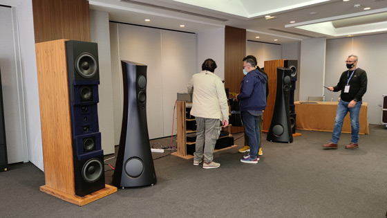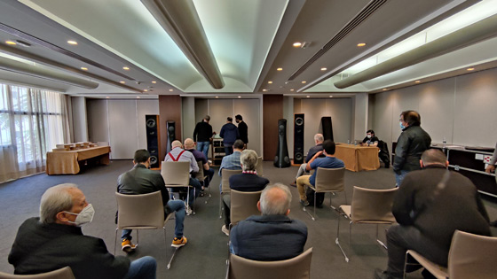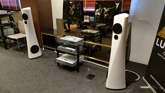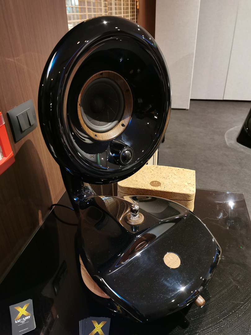 Estelon, Cello È sempre un piacere trovarsi di fronte un paio di Estelon per via della loro eleganza formale e, naturalmente, per il suono "grande" che sono in grado di produrre, il cui modello Forza avevamo avuto modo di apprezzare anche all'High End di Monaco di Baviera. Dunque ricordiamo che "le Forza utilizzano 5 altoparlanti Accuton suddivisi in quattro vie costituite da due woofer da 250mm con un sandwich di alluminio, un midwoofer da 190mm con la stessa struttura, midrange ceramico da 168mm e tweeter in diamante da 25mm. Il peso di ciascun diffusore è di ben 150kg e ha una sensibilità di 90 dB". Non a caso, nelle grandi sale di Luxury Group di Alfredo Scauzillo, il programma musicale aveva connotati che indubbiamente esaltavano la capacità degli speaker di generare musica che pervadeva la sala non solo con "polarità" orizzontali, ma anche e soprattutto con un'ampia estensione verticale, non sempre presente in altri ascolti un po' inscatolati. Estelon è un marchio nato in Estonia (come le prime tre lettere del brand lasciano far presagire), di cui Luxury Group è importatore esclusivo per l'Italia. Si tratta di speaker dotati di un forte impatto estetico, che gli ha consentito di vincere il Red Dot Design Award, e il CES Best of Innovation più in generale per le qualità dei prodotti. La linea produttiva è molto ampia e va dalle piccole XC MKII, dalla tipica configurazione D'Appolito e dalla probabile vocazione all'audiovideo (con il centrale X-Centro MKII) alle imponenti Extreme Limited Edition MKII. Ma Luxury distribuisce anche altri marchi quali Cello, Metaxas & Sins, Moonriver Audio, Once, Pilium, Siltech e Transcriptors. In un angolo della prima sala c'era un set in quel momento inattivo con un paio di Estelon YB MKII di colore bianco (20.500€). Sul "palco" troneggiava invece il primo paio (di sole 10 coppie) di Estelon Forza Anniversary Edition nere, grandi anzi grandiose in tutto: 1,65 metri di altezza, 2 woofer da 25 cm, un midwoofer da 19 cm, un midrange in ceramica da 17 cm, un tweeter da 2,5 cm in diamante, impedenza nominale 3 Ohm (con un minimo 2 Ohm a 42 e 110 Hz, quindi attenzione alla scelta dell'amplificazione, che naturalmente non può scendere sotto i 20 watt), una sensibilità di 90 dB, per 150 chilogrammi a speaker e un prezzo di listino di 140.000€. Le elettroniche erano delle Burmester: fonte CD classic line 061, preamplificatore top line 088 e amplificatori finali Top Line 911 MKIII (tanto per capirci, 350 Watt per canale, un damping factor di 2750 e una alimentazione con capacità di filtraggio di 130.000 uF). L'ascolto confermava appieno le qualità tecniche anticipate su carta dalle caratteristiche dichiarate, che invitano il fortunato acquirente ad individuare accuratamente i compagni di viaggio degni di queste ammiraglie del suono. Quasi relegate in un angolo era esposta la chicca delle Once Su (9.950€), curiosissimi speaker wireless scuri a forma di tromba di diffusione dei vecchi megafoni (La voce del padrone): dei due vie autoamplificati a valvole con una potenza di 70 Watt, purtroppo proposti in forma statica. La seconda sala era davvero enorme e le Estelon Forza nere erano affiancate da un paio di imponenti Sovereign/2001, speaker vintage che però produceva l'effetto di farle sembrare quasi piccole. Qui il suono delle Estelon appariva più intenso e coinvolgente, forse anche per via della sorgente Wadia, del preamplificatore e della potente triamplificazione Cello che consentiva di riprodurre musica ad un volume davvero generoso, ma non debordante: niente effetto PA, insomma. La selezione musicale rimaneva volutamente epica, adatta ad esaltare i punti di forza del suono che inondava sonicamente la sala. Per maggiori informazioni sui prodotti distribuiti da Luxury: luxurygroup.it