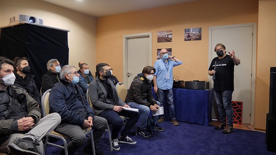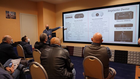 All'Hi-Fidelity romano, come d'altra parte alle manifestazioni gemella milanese e cugina monacense, sono pochi gli espositori che espongono un set video con audio multicanale. Tra questi vale senz'altro la pena di ricordare l'impianto installato da Gruppo Garman, tornato a partecipare alla rassegna, in sala Augusto, con un set dai connotati innovativi e stuzzicanti. Solo per incidens do conto del fatto di aver apprezzato il rispetto rigoroso delle norme anticovid, che prescrivevano una capienza massima nella saletta di 8 persone, senza furberie di sorta. La fonte dell'impianto era rappresentata una coppia di lettori universali basati su SoC Mediatek MTK 8581, ovvero Ipuk UHD8592 (distribuito da Cinema e Sound) e Reavon UBR-X200 (distribuito da Audiogamma): si tratta di praticamente di cloni dell'Oppo UDP-203 (purtroppo non più in produzione), benché molto diversi tra loro per componenti accessori e firmware. Come sorgente c'era anche il lettore multimediale Zidoo Z9X, basato sul nuovo SoC Mediatek RTD1619DR. Tutte e tre le sorgenti erano collegate al sintoamplificatore integrato Marantz SR-8015, che pilotava un set in configurazione Dolby Atmos 5.2.4 con sistemi di altoparlanti e sub Definitive Technology (con tecnologia dipolare, tweeter con cupola in alluminio e sub integrato) costituito da una coppia di torri anteriori BP9060 (con sub da 10"), da una coppia di torri posteriori BP9040 (con sub da 8") e il canale centrale CS9060 (sempre con sub da 8" integrato): le 4 torri avevano sulla loro sommità gli eleganti moduli aggiuntivi A90 height stilisticamente perfettamente integrati, orientati verso il soffitto, al fine di creare la 'dimensione verticale' dei segnali immersivi Dolby Atmos e DTS:X di cui poi in sala si sarebbero apprezzate le prime riflessioni. Va qui pure osservato che la soluzione con sub integrato autoamplificato (in classe D) proposta da Definitive Technology consente indubbiamente di ottenere un risultato di grande effetto con poca energia di pilotaggio, in quanto sgrava a monte l'amplificazione dal dover leggere il difficile carico costituito dalla gamma bassa/ultrabassa. Completavano il sistema ben due nuovissimi subwoofer della serie Descend modello DN12, con driver da 12", doppio radiatore passivo da 12" e potenza fino a 1.500 watt. Lo schermo era un grande ALR Dark Star 9 da 3,5 metri di base con rapporto d'aspetto in 21:9, illuminato dal nuovo videoproiettore con sorgente luminosa ibrida laser e fosfori Epson LS11000, di cui potete leggere una recensione - con misure - sull'anteprima nazionale in questo articolo. La sala prevedeva dimostrazioni a rotazione di tre 'mediatori tecnologici' differenti, tutti con la 'propria' sorgente di riferimento: il lettore Ipuk veniva utilizzato principalmente da Francesco Aliotta (Audio Quality), il Reavon da Emidio Frattaroli e lo Zidoo da Gian Luca Di Felice. Quest'ultimo ha sostituito più di una volta il Frattaroli, occupato con le interviste dei protagonisti di questa edizione del Roma Hi Fidelity 2021 ed è stato di fatto l'attore principale di tutte le dimostrazioni e giusto un paio assieme ad Emidio Frattaroli. Sia Gian Luca che Emidio hanno utilizzato il segnale video nativo delle sorgenti, senza ulteriori elaborazioni. Negli altri quattro appuntamenti giornalieri, Francesco Aliotta mostrava anche il notevole boost del sofisticato DSP video madVR Envy che correggeva la colorimetria, effettuava il tone mapping dinamico dei contenuti HDR, ottimizzava dettaglio e risoluzione con una maschera di contrasto estremamente sofisticata, oltre a provvedere anche elaborazioni sul rapporto d'aspetto per riempire in maniera intelligente l'enorme schermo in 21:9 da 3 metri e mezzo di base Dark Star 9. Tra le varie dimostrazioni possibili, come recentemente avvenuto a Milano, mi è capitata in sorte la presentazione curata dal bravo Francesco Aliotta di Audio Quality. Dopo la doverosa introduzione destinata a presentare il nuovo videoproiettore Epson LS11000, il primo laser con tecnologia LCD trasmissiva 4K vobulato con copertura al 90% dello spazio colore DCI-P3, Aliotta si è soffermato sulle caratteristiche dello schermo ad elevato contrasto Dark Star 9, con rapporto d'aspetto in 21:9, larghezza di 3,5 metri e certificazione ISF. La superficie del Dark Star 9 è dotata di nanostrutture che assorbono la luce che arriva sullo schermo ad elevati angoli di incidenza, riflettendo di fatto quasi esclusivamente quella che arriva dal proiettore. Questo particolare qualifica lo schermo come elemento ALR (Ambient Light Rejection, eliminazione della luce ambiente), donando alle immagini un rapporto di contrasto particolarmente elevato, soprattutto quando ci si trova in un ambiente tradizionale, con muri e soffitti di colore chiaro. L'altro importante componente della catena in dimostrazione era - come detto - il madVR Envy, il processore video più potente al mondo che assicura incremento del dettaglio, ricostruzione della risoluzione completa delle componenti cromatiche e calibrazione professionale con 3D LUT a più di 4.000 punti.