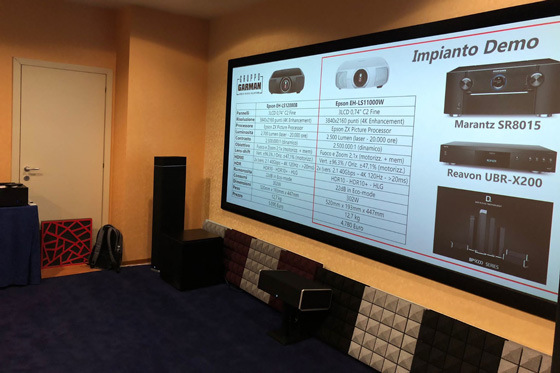 Buona parte del sistema in dimostrazione al Roma Hi-Fidelity, pur senza il madVR Envy, l'integrato Marantz (c'è un Athemn 1120 al suo posto) e qualche diffusore in meno, è attualmente all'interno della saletta home theater di Gruppo Garman, in via Boezio a Roma. C'è buona parte del sistema Definitive Technology (ci sono le due BP9060 e il centrale CS9060), con surround, surround back e 'Atmos' a soffitto della Canton, doppio sub SVS e lettore universale Reavon. Per maggiori informazioni: www.videoproiettoriroma.com