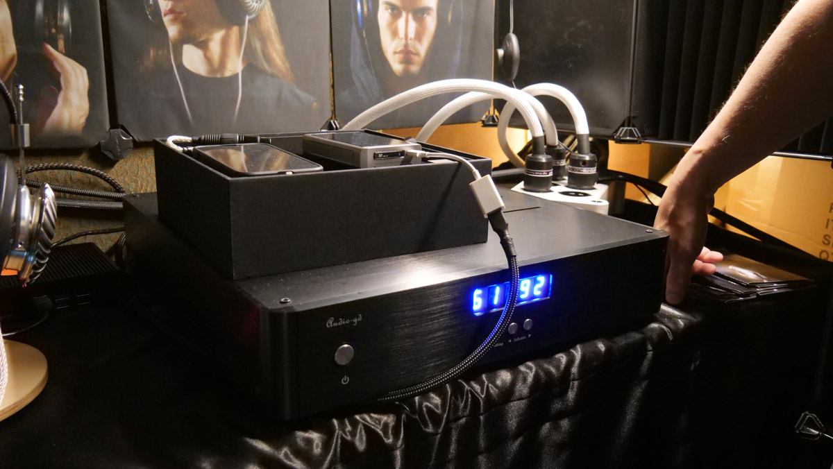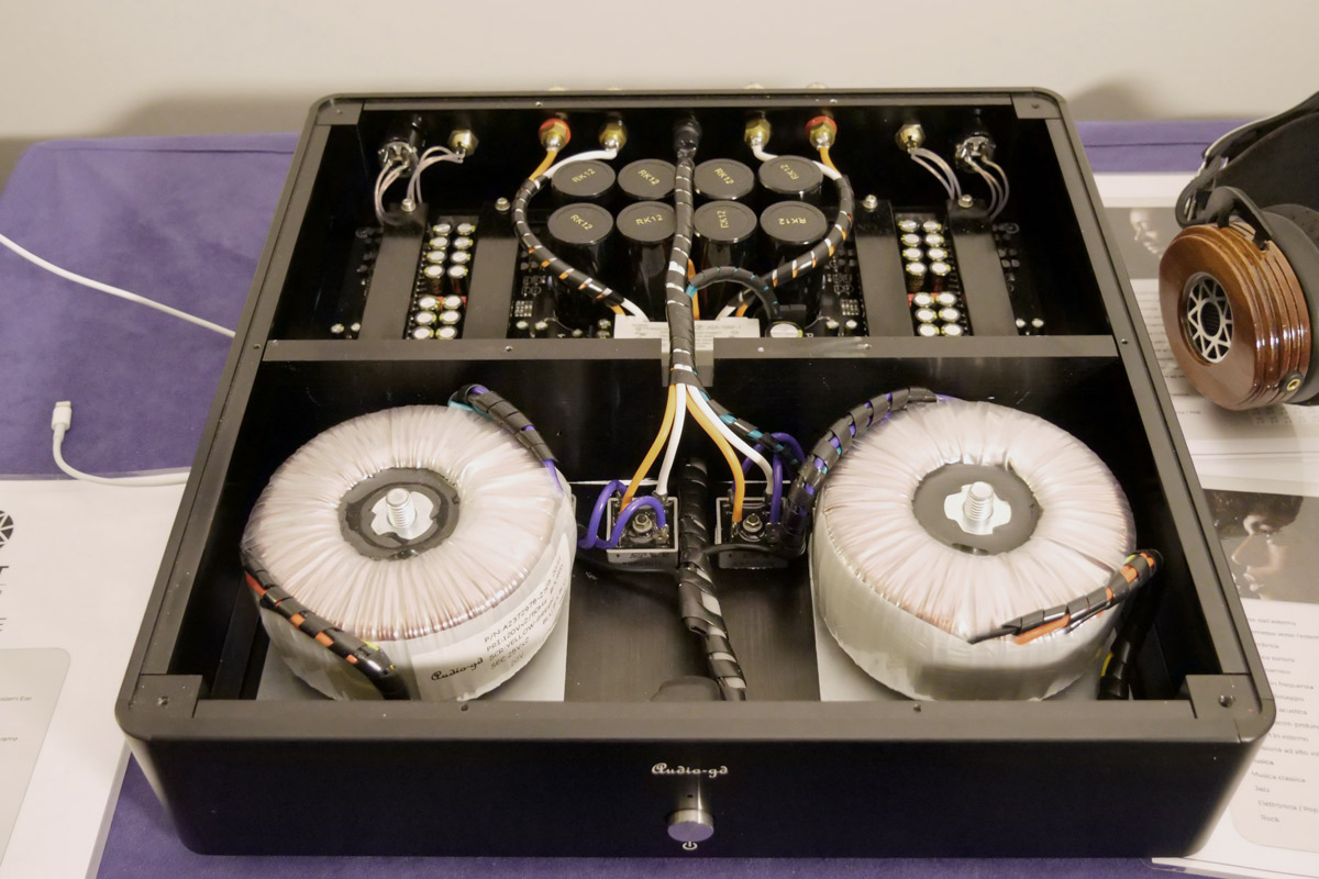 Mi sono seduto nella postazione. Oltre a Sigfrido, c’erano lo streamer server UPnP/DLNA, Spotify Connect, AirPlay, Roon Bridge e Squeezelite-R2 (compatibile con Deezer, Qobuz, Spotify e Tidal) Str@mbo (a partire da 800 Euro) alimentato dal suo Str@mbo super lineare (250 Euro) ed anche il DAC Audio-gd R7 R2R MK2 (2.680 Euro) che già nella sua prima versione ricevette il Blue Moon award da 6Moons con costruzione a componenti discreti, sistema di riduzione del jitter, uscite bilanciate e sbilanciate.