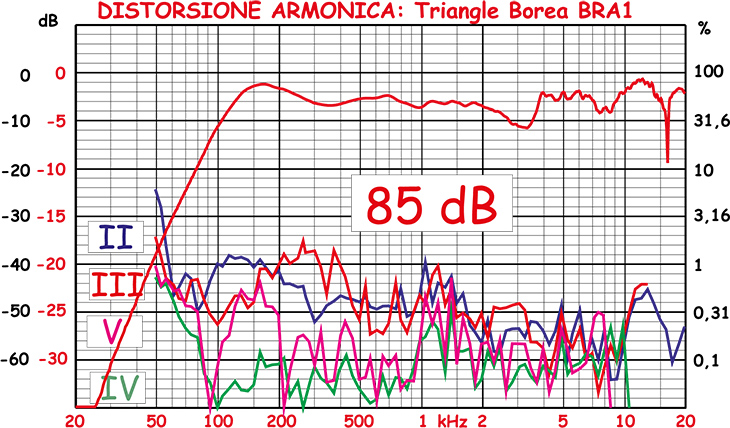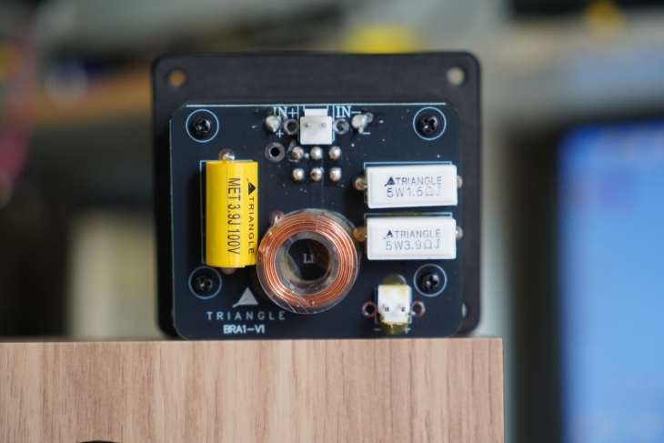 La costruzioneViti di fissaggio: Sotto le guaine di protezione adesive troviamo sei viti autoperforanti per il woofer ed un numero imprecisato, credo quattro, per il tweeter. Gli adesivi usati dalla Triangle per le flange di gomma sono micidiali per la loro forza. Il costruttore ha creduto bene di incollare anche i cestelli degli altoparlanti, che diventano assolutamente non rimovibili senza danneggiare il mobile. Ovviamente la tenuta stagna è assicurata. Assorbente interno: mobile completamente riempito di acrilico nero, visto dopo la rimozione della vaschetta porta contatti. Rinforzi: Assenti, grazie alle dimensioni contenute del box. Pannello frontale: I driver, come si vede anche dalle foto, hanno la flangia di fissaggio ricoperta da guaine di gomma che celano le viti di fissaggio ed i piccoli difetti di diffrazione che queste si portano dietro nel decadimento temporale. Condotto: assente Crossover: Il crossover è fissato sulla vaschetta porta contatti. Schema semplice, col woofer che non utilizza assolutamente alcun componente, connesso nella pratica direttamente ai morsetti. Il tweeter è filtrato con un secondo ordine elettrico. Questo presenta dopo il passa alto vero e proprio, ovvero condensatore ed induttanza, due diverse resistenze di attenuazione comandate da un deviatore per i due diversi posizionamenti possibili. In particolare la pressione emessa dal tweeter viene aumentata (resistenza di soli 1,5 ohm) se si posiziona il BRA1 sopra un diffusore frontale mentre viene attenuata (resistenza di 3,9 ohm) se il diffusore viene fissato a parete (in alto). Condensatore: poliestere in serie al tweeter. Resistenze di attenuazione del tweeter in ceramica. Induttanze: una sola, sul passa alto del tweeter, avvolta in aria, con un valore misurato di 0,22 mH ma con una resistenza elettrica di 0.68 ohm. Woofer: non smontabile senza far danni. Non ci rimane che annotare il leggerissimo rifasatore plastico incollato al centro della membrana e l’anello di sospensione esterna in gomma. Tweeter: non smontabile senza far danni. Si notano due minuscoli rifasatori sistemati in verticale che comunque, stranamente, non caricano l’apice della cupola. Morsetti: una coppia di morsetti metallici montati su una vaschetta di plastica fissata sul retro del box e, per fortuna, rimovibile. Sopra i due connettori troviamo il deviatore per l’attenuazione diversificata del tweeter. Cavi: di sezione giusta.