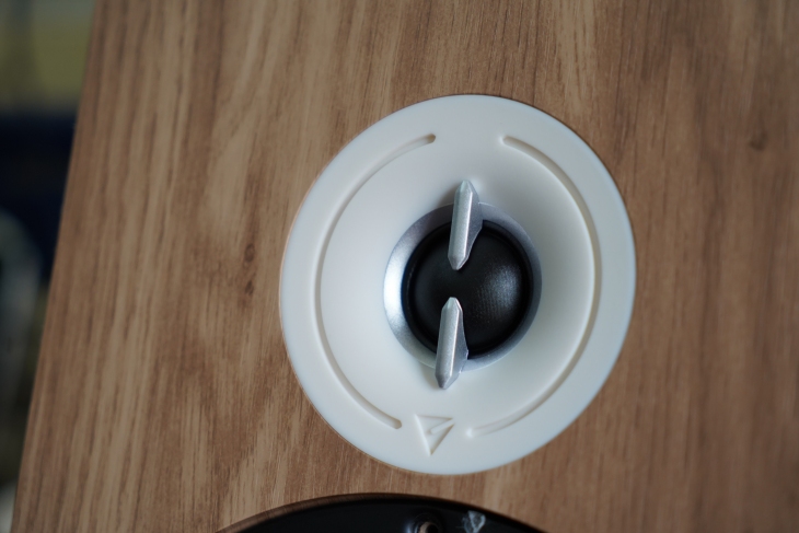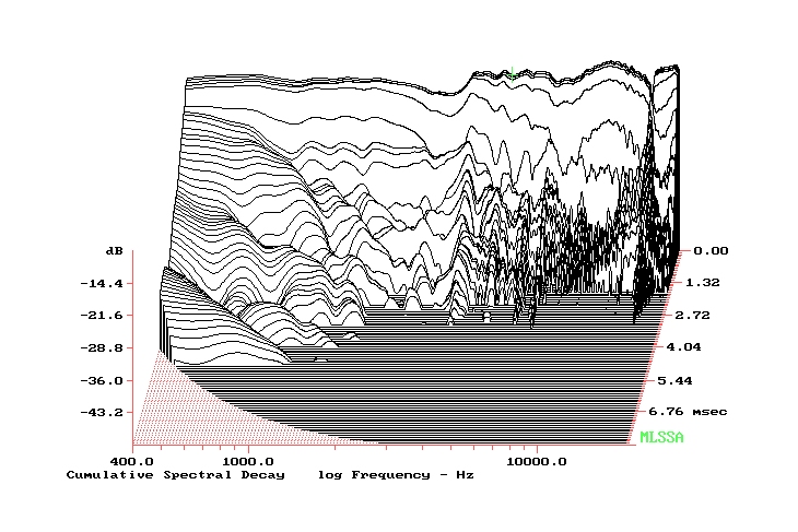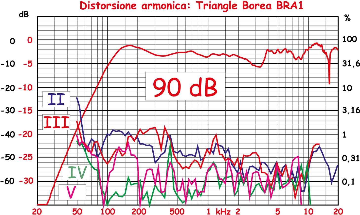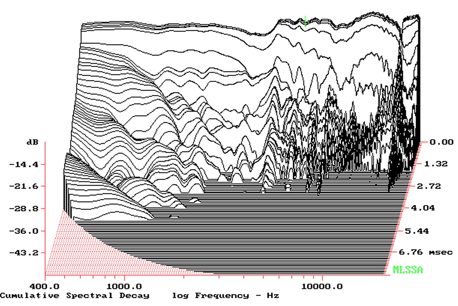 MisureRisposta: La risposta è stata rilevata sia in asse che come di consueto a 45° sull’asse orizzontale. Notiamo, con la filtratura del tipo A ovvero con la resistenza di 3,9 ohm in serie, una risposta regolare con un piccolo avvallamento nelle vicinanze della frequenza di incrocio. Notiamo anche un leggero sotto smorzamento a 160 Hz dovuto al Qtc del woofer nel volume chiuso. La ripresa a 45° è molto regolare, quasi da manuale, senza alcuna esitazione alla frequenza di incrocio e regolarmente calante alle alte frequenze. Risposta per i diversi posizionamenti: Rispetto alla risposta in asse abbiamo effettuato due ulteriori rilevazioni, uno col diffusore posizionato su una parete ed una col diffusore posizionato su un cabinet da pavimento. Ovviamente le attenuazioni sul tweeter sono state scelte come suggerite dal costruttore. Notiamo come le risposte a parete (curva verde) e in “modalità Atmos” (curva blu) siano praticamente coincidenti, a dimostrazione delle scelte corrette dei progettisti. Impedenza: Il modulo dell’impedenza mostra un picco abbastanza striminzito alla frequenza di accordo ed uno appena più ampio nell’intorno della frequenza di incrocio. La modesta variazione della fase conduce ad una condizione di massimo carico a 178 Hz che vale 3,5 ohm, appena più basso del minimo di modulo rilevato a 210 Hz. Time Energy: Decadimento molto rapido, col secondo picco di dimensioni contenute che è dovuto al woofer che viene fatto lavorare a banda intera. Step response: La risposta al gradino mostra, come è ovvio, l’anticipo del tweeter sul woofer. Notiamo come il secondo picco, emesso dal woofer non filtrato, appaia leggermente, ed ovviamente, meno appuntito sul picco. Waterfall: la waterfall mostra qualche intemperanza in gamma media dovuta, con tutta probabilità, all’assenza del filtro passa basso sul woofer. Buona la gamma medioalta e leggermente risonante quella alta ed altissima. Terzi di ottava: La risposta è stata effettuata col diffusore sistemato, con qualche peripezia, su una parete a circa 210 cm. dal pavimento col deviatore del filtro spostato su A, ovvero sulla attenuazione del tweeter indicata dal costruttore. Possiamo notare due particolari: il rigonfiamento, per altro prevedibile, della gamma bassa ed un andamento in gamma alta abbastanza simile alle misure effettuate in condizioni anecoiche. THD: con buona aderenza alla teoria del diffusore caricato in sospensione pneumatica annotiamo una distorsione molto contenuta in gamma bassa dovuta, per quanto riguarda l’escursione, proprio al tipo di carico. Soltanto a 95 dB di pressione media vediamo la seconda e la terza armonica salire, ma in un range di frequenza che non appartiene al tipo di emissione di questo diffusore. Notiamo nelle tre posizioni varie esitazioni della quinta armonica che si mantiene alquanto ballerina specialmente in gamma media. Articulation Test: Eccellente il comportamento nell’Articulation Test. Vediamo infatti, a tutte le pressioni prese in considerazione, un andamento che si mantiene a cavallo dei -40 dB con un comportamento che migliora leggermente sia alle basse frequenze che alle altissime
