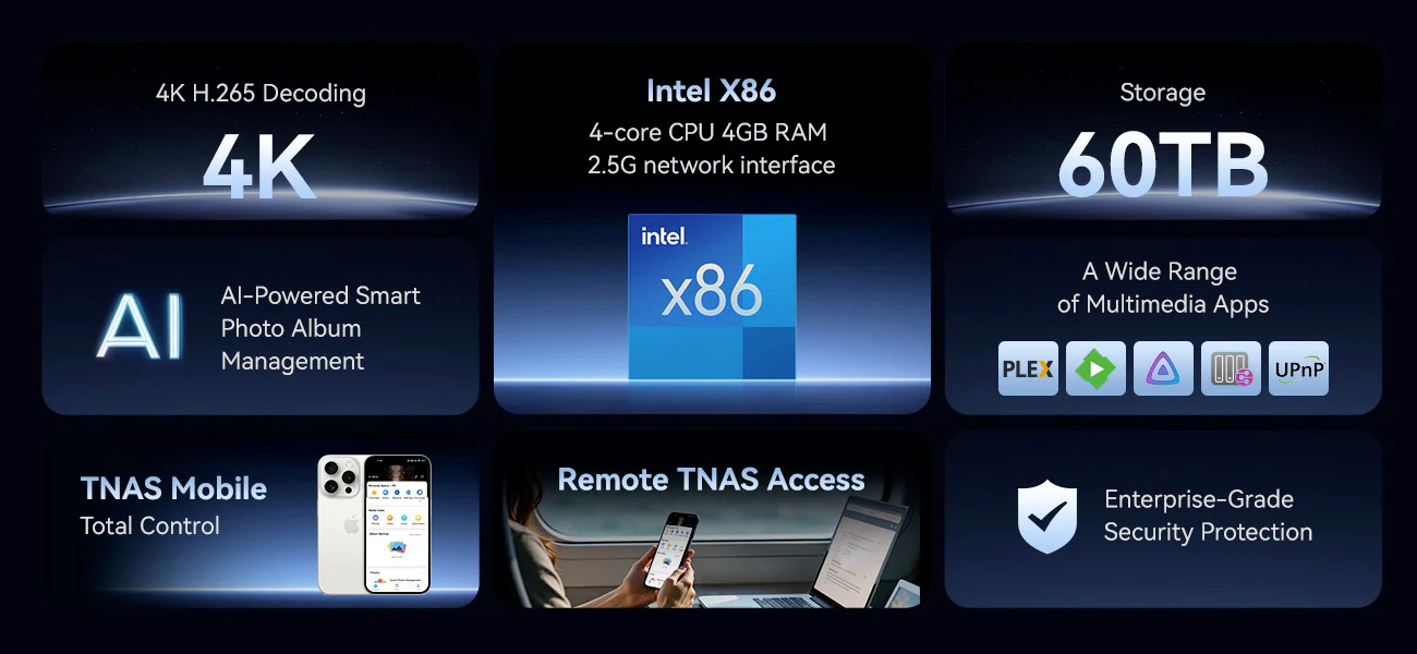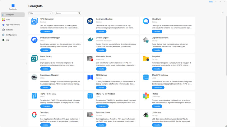 UnboxingIl dispositivo è conservato in una scatola di cartone rigido, tipica di tutti gli altri dispositivi Terramaster con cui abbiamo già avuto a che fare. All'interno della confezione il NAS è ben riparato tra due supporti di gomma semirigida, dotati di spessore consistente, che evitano anche ogni possibile movimento del dispositivo stesso all'interno della scatola, proteggendolo anche da eventuali urti esterni. All'interno della confezione, oltre all'F2-425 troviamo l'alimentatore da 48 Watt (12V - 4A), un cavo di rete RJ-45, una guida di installazione rapida, alcune note di garanzia ed alcune viti per il montaggio. Il server di rete presenta un look rinnovato rispetto ai vecchi modelli a cui eravamo abituati, con uno stile decisamente pù moderno e accattivante, con una livrea completamente nera che restituisce un'immagine molto più professionale e in linea con i dispositivi dei competitor, rispetto al cabinet grigio e decisamente antiquato dei modelli precedenti. Sulla facciata anteriore sono posizionati il pulsante di accensione e spegnimento, un connettore USB 3.2 da 10Gbps, il led di stato e i due led di controllo degli HDD interni, le due slitte per i dischi rigidi. Nella parte posteriore, oltre alla ventola di raffreddamento troviamo un connettore HDMI, 2 porte USB3.2 (1 da 10Gbps ed una da 5Gbps), un connettore RJ-45 da 2,5Gbps, il connettore di alimentazione, un foro contenente il pulsante di reset. Hardware & costruzioneIl TerraMaster F2-425 utilizza una scocca in metallo con pannelli superiori e laterali in alluminio estruso, mentre il frontale e il retro sono realizzati in plastica rigida. La ventola posteriore si occupa sia del raffreddamento degli hard disk sia del SoC Intel; la rumorosità dichiarata è di 19 dB(A) ma dipende fortemente dal tipo di dischi installati. Il raffreddamento interno adotta un layout canalizzato che crea un flusso d’aria diretto dalle baie anteriori verso la ventola, evitando la formazione di sacche di calore localizzate. L'alimentatore è esterno, soluzione che riduce il calore interno ma introduce un ulteriore ingombro. In uso il NAS non presenta vibrazioni significative, merito del peso inferiore ai modelli più grandi e del pannello metallico superiore che riduce le risonanze prodotte dagli HDD meccanici. InstallazioneGrazie al QR Code presente sulla guida di installazione rapida possiamo visionare un video che ci guida al montaggio dei dischi e all'installazione del sistema operativo passo passo. In realtà se ne potrebbe fare anche a meno, visto che i passaggi sono estremamente intuitivi e semplici ed alla portata di qualsiasi utente di media esperienza. Il TerraMaster F2-425 adotta un pratico meccanismo di slitte hot-swap che consente di installare o sostituire i dischi in pochi secondi, senza dover spegnere il NAS o utilizzare utensili. Le slitte con sgancio rapido sono progettate per ospitare HDD da 3,5” in modalità tool-less, grazie a un sistema di fermi laterali in plastica che bloccano saldamente l’unità. Per gli SSD da 2,5” è invece previsto un montaggio tradizionale con viti, garantendo la massima compatibilità. L’estrazione della baia avviene tramite un gancio frontale a leva, che semplifica la rimozione del disco in totale sicurezza. Questa soluzione non solo accelera le operazioni di manutenzione e upgrade, ma riduce anche il rischio di danneggiamenti, offrendo all’utente un sistema robusto e immediato per la gestione dello storage. Tutto il montaggio, grazie all'estrema facilità, si è risolto in qualche minuto. In particolare, abbiamo utilizzato due HDD da 3,5" Western Digital RED Plus da 4 Terabyte ciascuno. Collegati l'alimentazione e il cavo di rete possiamo procedere all'installazione del sistema operativo vero e proprio. L’installazione di TOS 6.0 sul TerraMaster F2-425 avviene in maniera guidata: tramite il software TNAS for PC liberamente scaricabile dal sito del produttore, effettuiamo un scansione della rete per trovare il nostro NAS di cui al momento non conosciamo l'indirizzo IP che è stato assegnato dal nostro router. Una volta individuato il NAS procediamo con l'installazione vera e propria grazie all'interfaccia web: è sufficiente accedere al NAS da browser, caricare il pacchetto firmware e seguire la procedura automatizzata. Il sistema provvede in autonomia a configurare i servizi di base, lasciando all’utente solo la scelta dei parametri principali. L’intero processo richiede pochi minuti e non richiede competenze avanzate. In realtà un utente esperto può decidere di configurare tutti i parametri del NAS a piacimento, come tipologia del RAID, file system da utilizzare, personalizzazione del disco di sistema e del pool di archiviazione, creare una cache tramite SSD, etc. Questa volta abbiamo deciso di seguire la procedura semplificata di installazione con le impostazioni predefinite. Ovviamente non ci è stato permesso di configurare assolutamente nulla e alla fine del processo abbiamo ottenuto un pool di archiviazione nella configurazione RAID proprietaria di Terramaster TRAID e file system BTRFS, progettato per la gestione dei dati e la tolleranza agli errori, che offre funzionalità avanzate come snapshot, integrità dei dati tramite CRC, compressione trasparente e clonazione. Sistema operativoTerraMaster ha da poco lanciato la sua ultima versione del sistema operativo per NAS, il TOS 6.0, promettendo una significativa evoluzione rispetto alla precedente versione, la 5.0. Questo aggiornamento non è un semplice "restyling", ma un vero e proprio rilancio che mira a migliorare l'esperienza utente, la sicurezza e le prestazioni, posizionando l'azienda come un attore sempre più rilevante nel panorama dei sistemi di archiviazione di rete. Il sistema operativo TerraMaster TOS 6.0 rappresenta la nuova generazione della piattaforma software che gestisce i NAS dell’azienda, con un’interfaccia più moderna, fluida e intuitiva, pensata per semplificare l’esperienza d’uso sia agl
