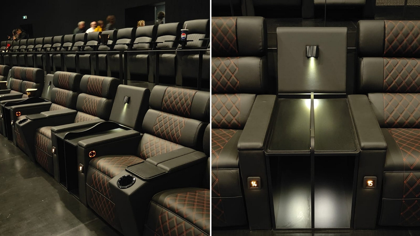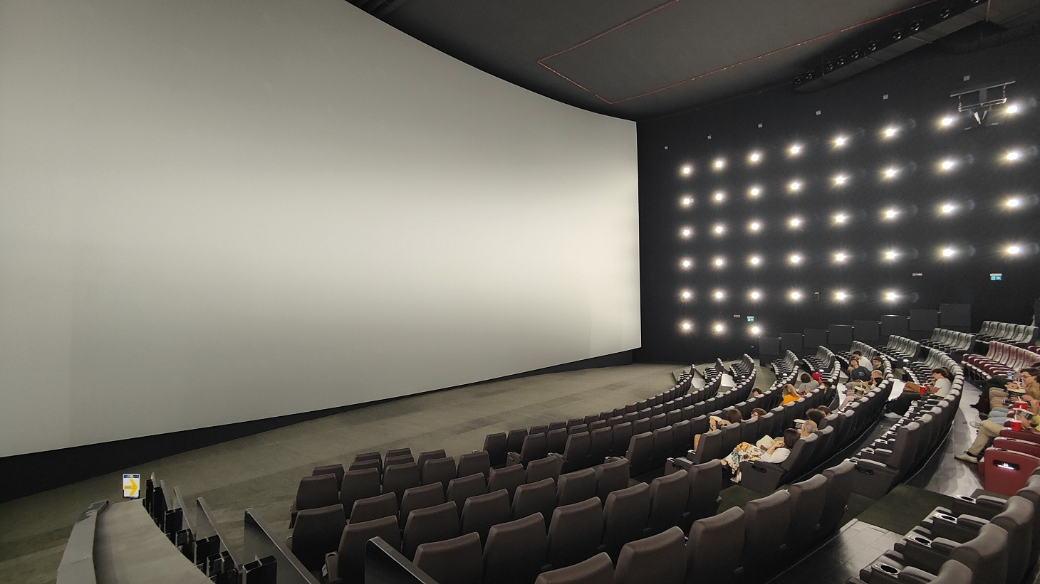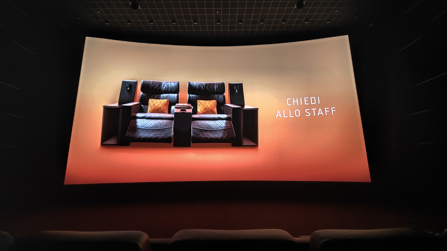 La sala di Silea è leggermente diversa rispetto a quella di Rozzano. La superficie dello schermo sembra identica e probabilmente anche le dimensioni. Qui però lo schermo è totalmente piatto. Non c'è nessun tipo di curvatura e considerando il guadagno della superficie e il rapporto di tiro dei proiettori, mi aspetto effetto spot e vignettature nei lati e negli angoli particolarmente evidenti. Ci sono sempre 9 file esattamente come a Rozzano ma il numero di posti è leggermente inferiore. Ho contato circa 50 posti in meno rispetto a Rozzano. anche le potrone sono diverse ma sempre larghe e comode, solo appena più morbile.