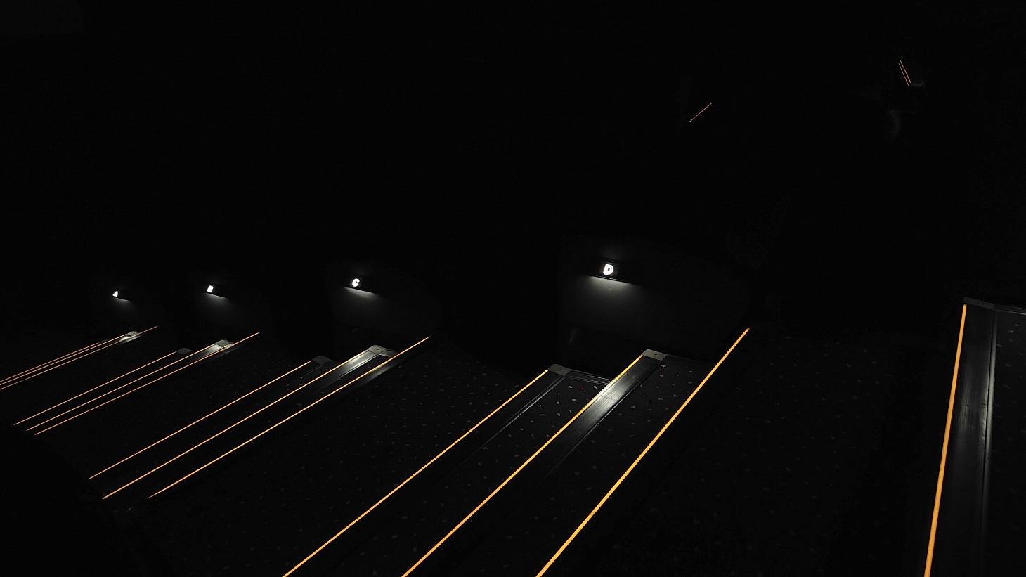 Purtroppo il livello di inquinamento luminoso durante la proiezione secondo me era fin troppo elevato, non soltanto per i LED arancioni dei gradoni, per le indicazioni delle file e per i faretti nello spazio tra le poltrone ma anche per i due lampioni, davvero eccessivi, posti nelle nicchie delle due uscite di emergenza che sono in basso, ai lati dello schermo. L'inquinamento luminoso ai due angoli inferiori dello schermo era davvero imbarazzante. Per l'analisi mi sono seduto in due file, la n. 5 e la n. 7 sempre in posizione centralissima.