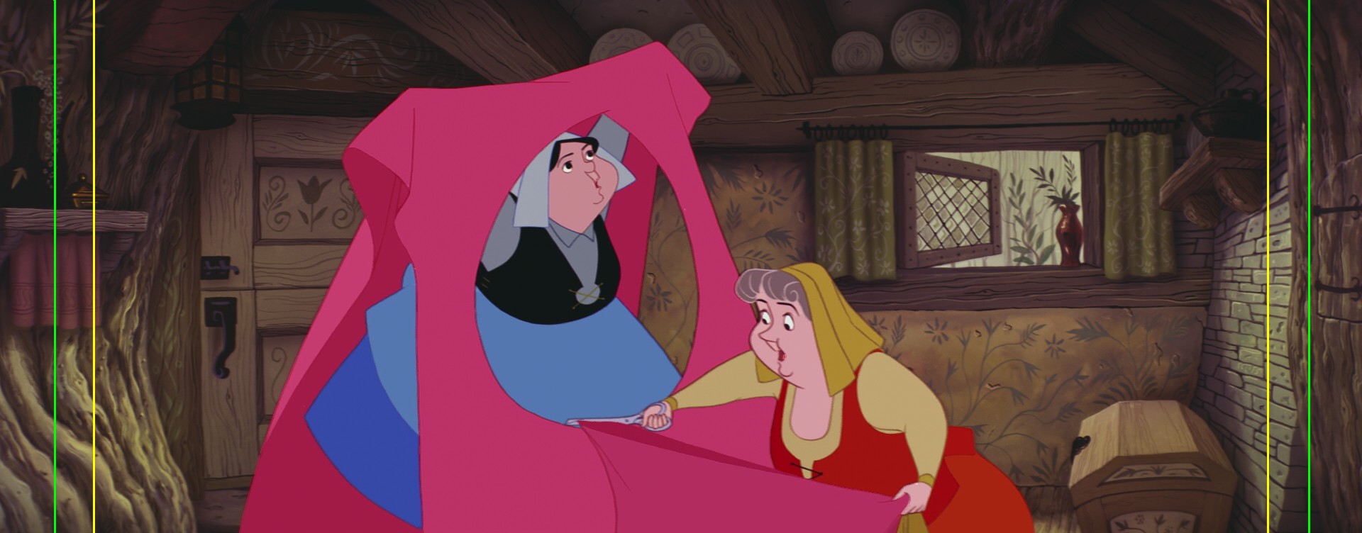 Il formato 70mm era grande, con elevata risoluzione ma aveva l’audio su 6 piste magnetiche che rubavano molto spazio riducendo il rapporto addirittura a 2,20:1. Sarebbe allora lecito chiedersi: quale di questi è il vero rapporto di immagine del film? Il formato che consente di vedere il maggiore numero di particolari presenti sul negativo è il 2,55:1 , la logica conclusione, adottata poi anche dai realizzatori dell’edizione Blu-ray, è che è quello che gli animatori intendevano venisse usato, mentre gli altri sono da considerarsi come degli adattamenti per gli altri sistemi presenti all’epoca. Pagina 5 - Restauro delle immagini e qualità video
