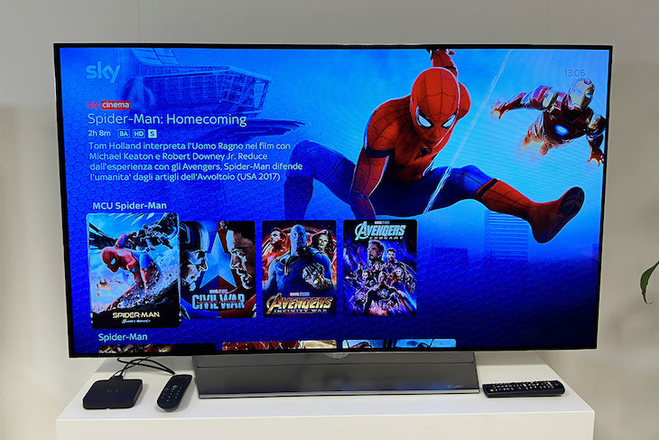 Su Sky Stream queste problematiche semplicemente non esistono: quando si cerca un film, una serie TV o altro, vengono riportati i risultati che includono tutti i servizi accessibili, anche quelli a cui l’utente non è abbonato. È una scelta precisa: Sky sostiene che così si può venire a conoscenza di contenuti interessanti su servizi che non si usano e si può quindi valutare se è opportuno abbonarsi. Se un determinato titolo è disponibile su più servizi, Sky OS li riporta tutti in modo da lasciare la libera scelta di quale usare. La ricerca si può inoltre effettuare non solo sulla base dei titoli ma anche nominando un attore: ho provato con alcuni dei più famosi e ho notato che nei risultati compaiono anche video su YouTube, a testimonianza del grande lavoro svolto a livello di integrazione. Con i futuri aggiornamenti si potranno anche aggiungere gli attori alle playlist, in modo da avere una scorciatoia rapida per vedere tutti i contenuti disponibili dove sono presenti. Alle informazioni fornite dai metadati si aggiunge poi la mano di Sky, che come abbiamo visto interviene a vari livelli, dai consigli fino alle pagine che includono i risultati delle ricerche. Queste schermate possono essere ulteriormente arricchite e personalizzate: è il caso di Spider-Man, la cui scheda include un’immagine personalizzata e più informazioni rispetto alla media. Chiudiamo questa ampia panoramica su Sky OS con “Esplora Sky Stream”, una sorta di guida passo-passo consultabile direttamente dal box. Ci sono varie sezioni che spiegano il funzionamento di tutte le principali funzioni: telecomando, comandi vocali, home, playlist, Primafila, digitale terrestre e applicazioni. Oltre a queste troviamo anche una parte con le indicazioni per risolvere i problemi più comuni. In alto è infine presente l’icona di una campanella (accanto a quella per tornare alla home): qui vengono segnalati gli aggiornamenti disponibili e i cambiamenti apportati. L’utente ha quindi uno strumento sempre a portata di mano che lo tiene informato sulle novità introdotte: un esempio è l’accesso ai contenuti pay-per-view di Primafila, non supportato inizialmente ma aggiunto in seguito.