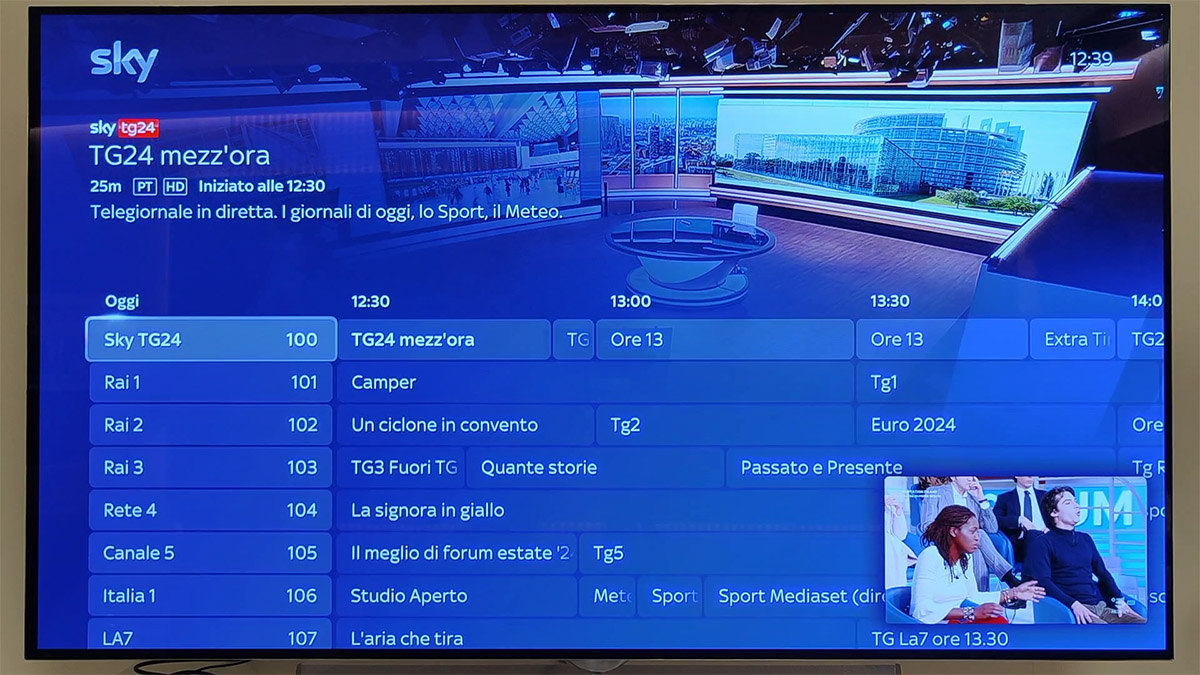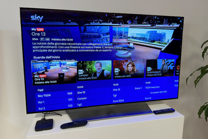Nelle playlist si possono caricare contenuti di tutti i tipi, da una trasmissione televisiva a una serie TV, passando per film, documentari eccetera. Questo principio vale per tutti i contenuti: sono inclusi quelli prodotti internamente, quelli trasmessi sui canali della pay TV, quelli proposti tramiti servizi di terzi integrati nella piattaforma Sky e anche i canali televisivi come Rai e Mediaset. Popolare una playlist è molto semplice: basta premere il pulsante “+” sul telecomando. In tutto si possono creare fino a 5 playlist per altrettanti membri della famiglia, ovviamente tutte completamente indipendenti. Le playlist servono anche a gestire i sostituti delle registrazioni, che qui funzionano diversamente dai box Sky Q via satellite perché non c’è un hard disk integrato. Quando si aggiunge un programma in playlist questo viene registrato in cloud e reso poi disponibile per l’utente. Si possono registrare praticamente tutti i canali sia di Sky sia di terzi ma trasmessi in streaming, come Rai, Mediaset e La7. In alcuni casi si può incorrere in limitazioni perché le emittenti potrebbero non disporre dei diritti per la visione in differita, come succede anche per RaiPlay. Sono però eccezioni piuttosto rare. Non si possono invece registrare i canali ricevuti esclusivamente tramite il digitale terrestre. Le registrazioni restano disponibili per 28 giorni, dopodiché si aprono due possibilità. Se il contenuto registrato viene inserito all’interno della libreria on demand di Sky o di un servizio partner, la registrazione si trasforma in un accesso al relativo catalogo ed è disponibile fino a quando il gestore della piattaforma ne detiene i diritti. In caso contrario dopo 28 giorni la registrazione non è più accessibile. Alle playlist si accede direttamente dalla home: sono una delle sezioni poste subito sotto i contenuti consigliati in evidenza, lungo una striscia orizzontale che propone anche altri contenuti suddivisi per aree tematiche. Abbiamo Serie TV e show, Cinema, Sport e calcio, Bambini, News e Musica. Scorrendo ancora verso il basso troviamo invece la Guida TV molto ben fatta e completa. La guida si può consultare per intero o selezionando una delle categorie già citate. Nell’angolo in basso a destra viene sempre visualizzata una finestra con la “mini TV”, che mostra le immagini dell’ultimo canale selezionato mentre si scorre l’elenco con tutti i programmi. Da notare che i canali proposti sono quelli trasmessi in streaming, sia per Sky sia per le altre emittenti. Il digitale terrestre è completamente separato dal resto: vi si accede selezionandolo come se fosse un’applicazione. L’utente può anche ignorarlo se non è interessato ai canali trasmessi che, come si può ben immaginare, non sono tutti presenti in streaming perché una versione veicolata in rete in vari casi non esiste (pensiamo ad alcune realtà locali, per esempio). Volendo si può scegliere di non collegare l'antenna terrestre: l'utilizzo è del tutto facoltativo. C’è anche una guida TV dedicata che è diversa e non è curata da Sky, a differenza di quella principale.