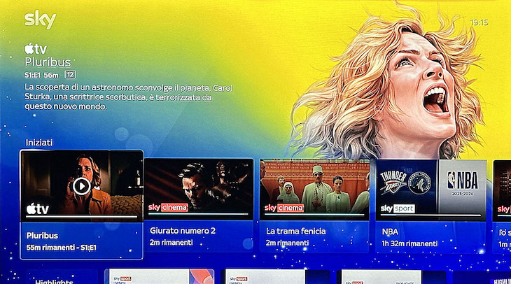 LA PROVA DI VISIONEL'installazione di Sky Stream è davvero semplice. Il dispositivo arriva già associato al proprio account: l'utente deve solo confermare premendo su "Sono io". Restano da configurare l'accesso alla rete, la connessione Bluetooth del telecomando ed eventualmente la sintonia del digitale terrestre, che è facolvativa. Se ci sono aggiornamenti disponibili, vengono scaricati e installati prima di completare il processo. Sky richiede inoltre di inserire il PIN per il parental control: il codice viene inviato separatamente, tramite email o SMS. Già alla prima accensione si nota che il piccolo dispositivo è molto reattivo: durante le prove non ho mai riscontrato scatti o incertezze, merito sicuramente delle ottimizzazioni apportate da Sky alla propria piattaforma. L'unica riserva sono alcuni rallentamenti all'apertura dei video on demand di Sky, che ho notato in rare occasioni e che si sono sempre risolti riavviando i contenuti. Non è del resto un segreto che questo progetto nasce da lontano: alla base ci sono anni di esperienza maturati sui set-top box di Comcast, la compagnia che controlla tutte le divisioni europee di Sky e che opera da anni in questo mercato con i dispositivi Xfinity. La reattività si nota non solo navigando all’interno dell’interfaccia ma anche nel cambio dei canali, che è decisamente rapido se consideriamo che si parla di contenuti veicolati in streaming. Una parte del merito va sicuramente attribuita allo streaming adattivo: all’inizio la qualità video è più bassa e si alza poi progressivamente fino a raggiungere il massimo possibile, ovviamente se la velocità della connessione internet lo consente. Non è però una questione ascrivibile solo a questa tecnologia: chi usa servizi streaming sa che anche avendo connessioni molto prestanti (Gigabit), può servire tempo per agganciare lo streaming in qualità più elevata. Da questo punto di vista Sky Stream mi è sembrato superiore alla media, anche sui programmi in 4K.