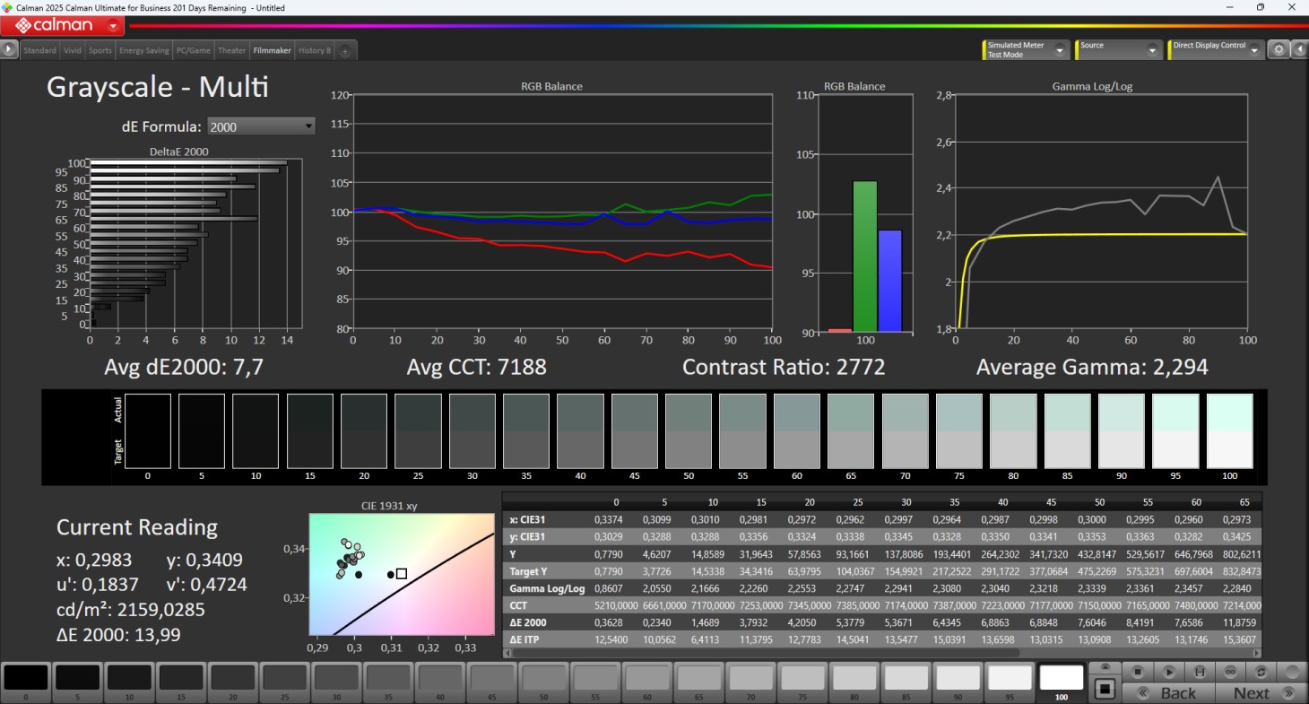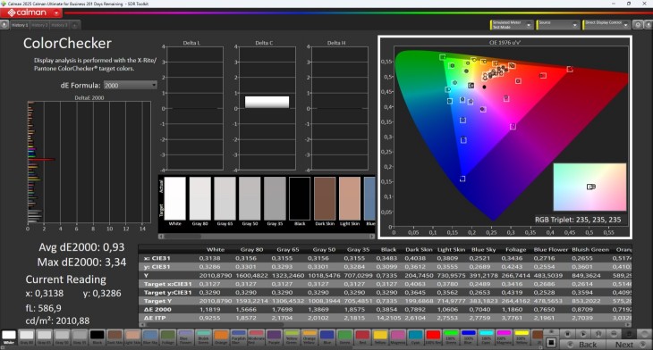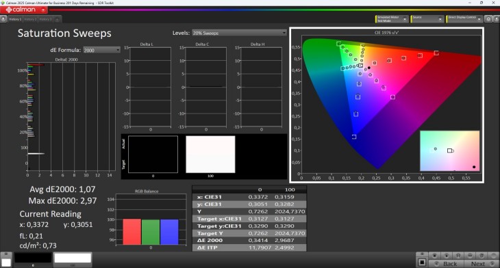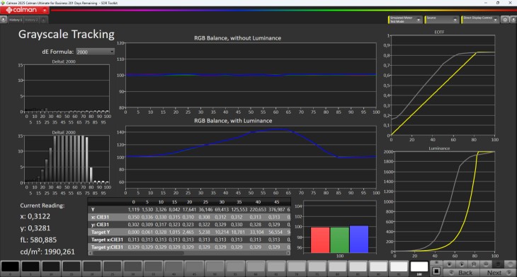 Misure in SDRcome al solito, tutte le misure sono state effettuate con sonda C6 HDR5000 profilata su spettrometro OceanOptics USB2000 ad alta risoluzione (2 nm FWHM), generatore VideoForge Pro e software Calman Ultimate di Portrait Displays. Le misure sul rapporto di contrasto sono state verificate con fotometro Minolta LS150. Nella modalità "Standard" le prestazioni sono mediocri, come nella quasi totalità di videoproiettori e TV sul mercato: bilanciamento del bianco troppo freddo e colori sovra-saturi con forti deviazioni della tinta. L'unica nota positiva - molto positiva - è la linearità del gamma. La situazione migliora sensibilmente nella modalità "Theater" anche se il bilanciamento del bianco rimane ancora un po' troppo tendente al ciano. Anche la riproduzione dei colori registra sensibili miglioramenti, sia per la saturazione che per la tinta. I valori del gamma rimangono praticamente perfetti. Nella modalità Filmmaker, la situazione migliora ulteriormente, soprattutto per quanto riguarda il bilanciamento del bianco che è ancora deviato leggermente verso il ciano ma che inizia ad essere accettabile. La riproduzione dei colori è simile a quella della modalità Theater. I valori del gamma invece sono sensibilmente differenti e il risultato è un'immagine più accattivante. La calibrazione è dannatamente facile e veloce e i controlli sono efficaci e prevedibili. Il risultato è sensazionale non solo dal punto di vista delle misure pure ma anche alla visione. La riproduzione dei colori a varie saturazione e a luminanza costante è particolamente precisa. Tanto previdsa da meritare un ulteriore approfondimento attraverso la misura delle numerose immagini test del ColorChecker, con tante patch sull'incarnato e con colori a diversa luminanza. Il risultato è più che ottimo con Delta E medio inferiore a 1 ed errore massimo relativo soltanto al rosso saturo al 100% che non ha praticamente effetti nella visione dei contenuti.
