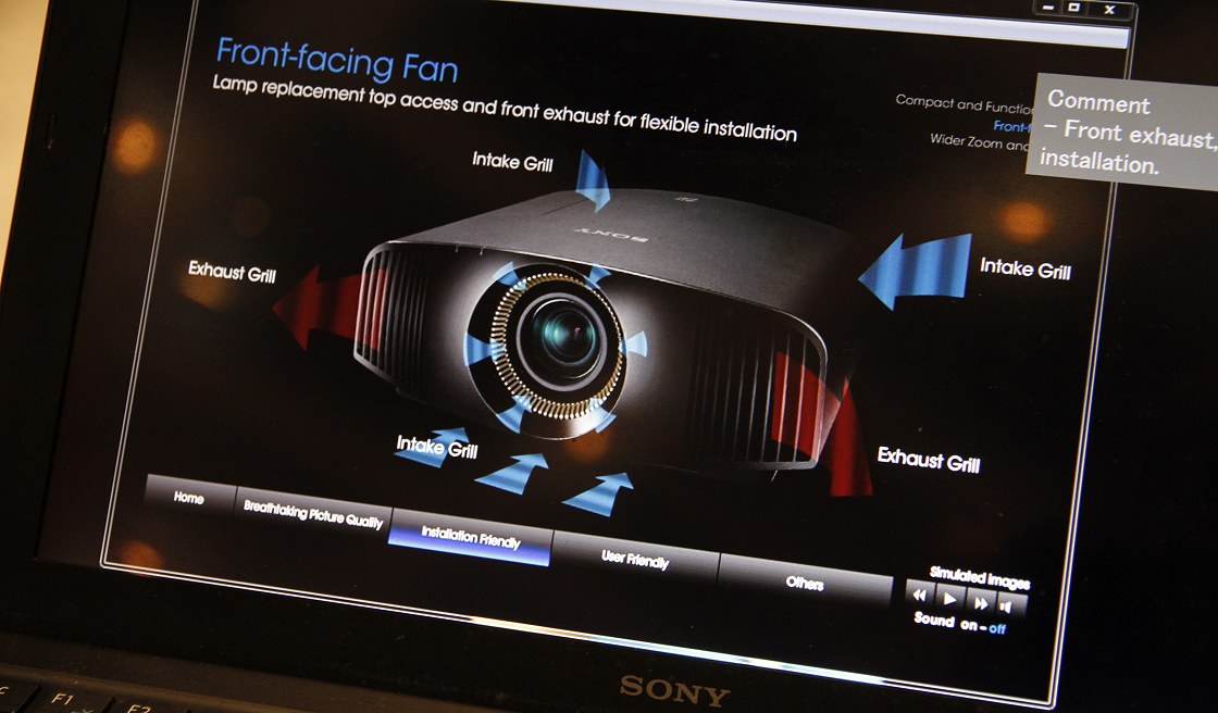 Iniziamo da châssis e obiettivo. Il telaio è nuovissimo, molto più piccolo (496 x 196 x 464 mm) e leggero (14 kg) ed è frutto di un attento studio del flusso d'aria che entra quasi da tutte le direzioni ed esce davanti, come nel disegno qui in alto. L'obiettivo del nuovo VW500 è sicuramente più economico e più piccolo ma - incredibilmente - leggermente più versatile. Il lens shift ora permette di traslare l'immagine in senso verticale fino all'85% dell'altezza, sia in alto che in basso. Inoltre il fattore di zoom è 2,05X, coon rapporto di tiro compreso tra 1,38:1 e 2,85:1. Obiettivo più economico vuol dire che avremo inevitabilmente perdite in termini di risoluzione. D'altra parte si tratta di un discorso prematuro: dovremo attendere di avere il proiettore in laboratorio per dare un giudizio oggettivo. I microdisplay SXRD, con risoluzione nativa di 4096x2160, sono esattamente gli stessi montati dal VW1000. C'è però una differenza sostanziale, riconducibile alla grande differenza nel rapporto di contrasto rispetto al VW1000. Tak Nakane ha sottolineato che nel VW1000, all'interno del percorso luminoso, è inserito uno speciale filtro che lavora in sinergia con i microdisplay SXRD e che permette un netto aumento del rapporto di contrasto nativo. Il rovescio della medaglia è nell'efficienza luminosa che per il VW10000 è talmente bassa da costringere all'utilizzo di una lampada molto potente. Nel VW500 manca questo filtro, il motore ottico è più efficiente (la lampada è da soli 260W) ma il rapporto di contrasto ne risente un pochino. Quello comunicato al netto dell'IRIS è di 200.000:1, contro il milione:1 del VW1000. La sezione di elaborazione è stata profondamente aggiornata. Sony ha ascoltato le critiche di molti appassionati e ha operato un netto miglioramento del Motionflow che ora ha una modalità che si integra perfettamente con il "black frame insertion". In realtà non si tratta di un vero e proprio inserimento di un fotogramma nero ma qualcosa di simile. Approfondiremo il concetto nell'articolo del test completo. Per il momento posso anticiparvi che questa nuova modalità permette in parte di ridurre l'effetto "telenovela" oltre che di avere un'efficienza luminosa nettamente supeiore rispetto al "vecchio" black frame insertion. Le novità non si limitano al Motionflow ma vanno ben oltre. La notizia più interessante è sicuramente la compatibilità con l'HDMI 2.0 e il pieno supporto al nuovo protocollo di protezione HDCP 2.2. Resta da verificare la possibilità di accettare segnali video con profondità colore superiore ad 8 bit per componente. Le altre novità riguardano la calibrazione colore. Prima di tutto c'è una funzione "auto calibration" che permette di "mettere il segno" alle caratteristiche dell'immagine: l'elettronica (con colorimetro all'interno del percorso luminoso) si occuperà di tutto il resto e modificherà i vari parametri delle immagini per seguire l'invecchiamento della lampada. La promessa insomma è che si dovrà calibrare il proiettore solo una volta, all'inizio. A proposito di calibrazione colore, segnalo anche il "ritorno" del CMS (Sony lo chiama RCP) che era scomparso dal menu del VW1000. Per quanto riguarda invece il gamut, nel VW500 non c'è più il filtro colore che taglia le frequenze del giallo dalla componente verde e che permette al VW1000 di raggiungere le coordinate colore DCI, anche se a prezzo di una notevole riduzione del flusso luminoso. Sul VW500 il filtro non c'è e quindi lo spazio colore è limitato a quello dell'alta definizione. In realtà le limitazioni dovrebbero valere solo per il verde mentre il VW500 dovrebbe spingersi un po' più in là sia per il rosso che per il blu. Avremo modo di controllare tutte queste promesse molto presto. Pagina 3 - Prime impressioni