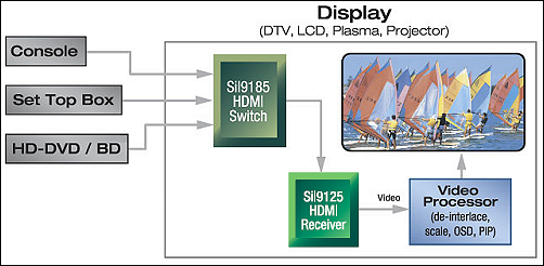 Sulla piccola scheda ad elevata integrazione, spiccano subito due chip Silicon Image, dedicati alla gestione e ricezione dei segnali HDMI. Il Sil9185 è uno switch HDMI 1.3 con tre ingressi ed una uscita. Il chip Sil9125 è il ricevitor vero e proprio. Dotato di due ingressi compatibili HDMI 1.3 è compatibile con segnali video fino a 36 bit di profondità colore complessiva.