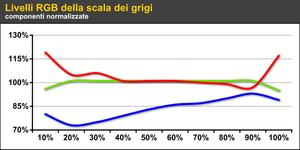 Il bilanciamento del bianco con le impostazioni "caldo2" è buono soltanto nella seconda metà della scala dei grigi. Più in basso c'è una sensibile deviazione verso il giallo-magenta. Le altre impostazioni ("caldo 1", "neutro") sono leggermente più lineari ma il punto di partenza è sensibilmente più lontano dal riferimento. In questo caso una taratura fine dal menu di servizio è auspicabile.