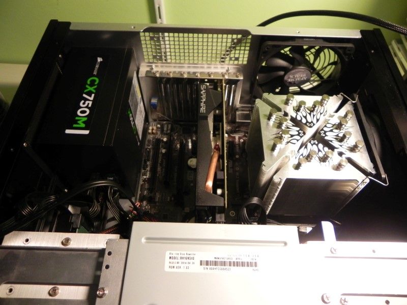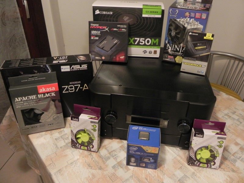 Dalla foto di gruppo che ho voluto fare prima assemblare il tutto potete notare le generose dimensioni del case il mittico Silverstone CW02, case che per costruzione e spazio ha pochi eguali, tuttavia manca all'appello la scheda video, era timida, comunque una funzionale R9 270 che per ora gestirà da sola il flusso audio/video verso il sintoamplificatore, il cervello è affidato ad un I7 4770S con un TDP di 65W.