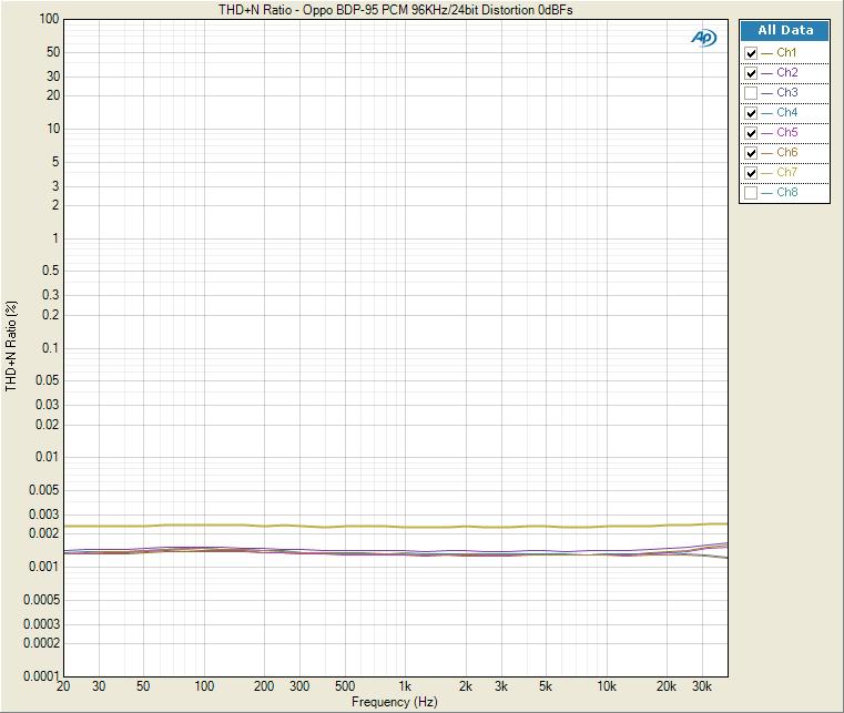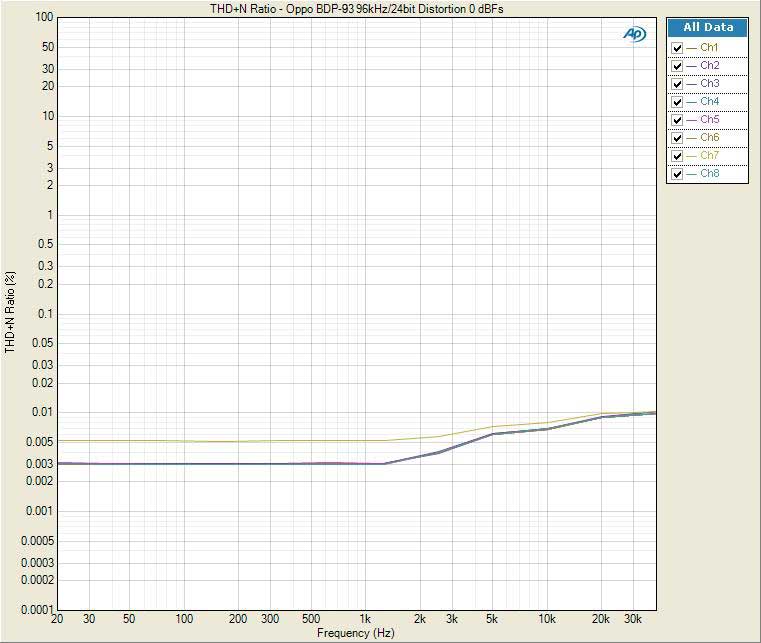 The BDP-93 THD+N was measured to be 0.003% THD+N rising up to 0.01% at 44kHz. Il BDP-93 THD + N è stato misurato da 0,003% THD + N che sale a 0,01% a 44kHz. The Oppo BDP-95 in comparison was ruler flat at 0.0015% THD+N all the way up to 44kHz. L'Oppo BDP-95 in confronto è stato righello piatto a 0,0 mila quindici% THD + N tutta la strada fino a 44kHz.