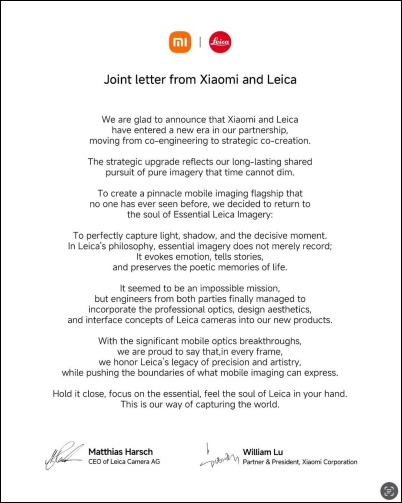In una lettera congiunta il colosso cinese Xiaomi e lo storico produttore tedesco Leica annunciano una nuova fase della loro collaborazione, passando dalla co-ingegnerizzazione alla co-creazione, anche in campo software