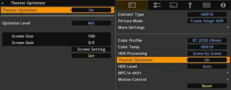 Entro il prossimo mese di novembre invece, JVC rilascerà un nuovo aggiornamento firmware che promette importanti miglioramenti proprio al Frame Adapt HDR. La prima novità è la funzione "Theater Optimizer", disponibile solo in sinergia col "Frame Adapt HDR", che permette all’installatore o all’utente di inserire le dimensioni dello schermo e le caratteristiche di guadagno, che variano in base alla tipologia di ambiente/installazione Home Theater e quindi calcola una serie di informazioni di installazione quali la posizione dello zoom, le condizioni della lampada e le relative impostazioni. A questo punto il proiettore viene regolato automaticamente in modo da ottimizzare la mappatura dei toni e la luminosità.