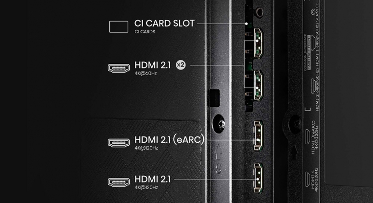 Il numero di porte HDMI è pari a quattro: due di queste sono HDMI 2.1 con possibilità di sfruttare segnali a risoluzione Ultra HD fino a 120 Hz (anche in Dolby Vision), Auto Low Latency Mode, Variable Refresh Rate, G-Sync e FreeSync Premium. Sulla HDMI 3 c’è anche eARC, il canale di ritorno audio che qui è affiancato dalle tecnologie EzPlay e WiSA SoundSend, che inviano l’audio in wireless ad altri prodotti compatibili (speaker o soundbar).