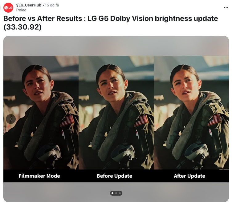 LG ha aumentato la luminanza del Dolby Vision sui TV OLED C5 e G5 (che abbiamo recensito qui). La novità è arrivata tramite l’aggiornamento 33.30.092, che va a risolvere un limite che molti utenti avevano segnalato. In pratica il Dolby Vision risultava più scuro rispetto a HDR10, specialmente nella modalità Cinema Home. La visione in ambienti non oscurati poteva quindi apparire un po’ troppo spenta.