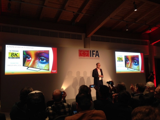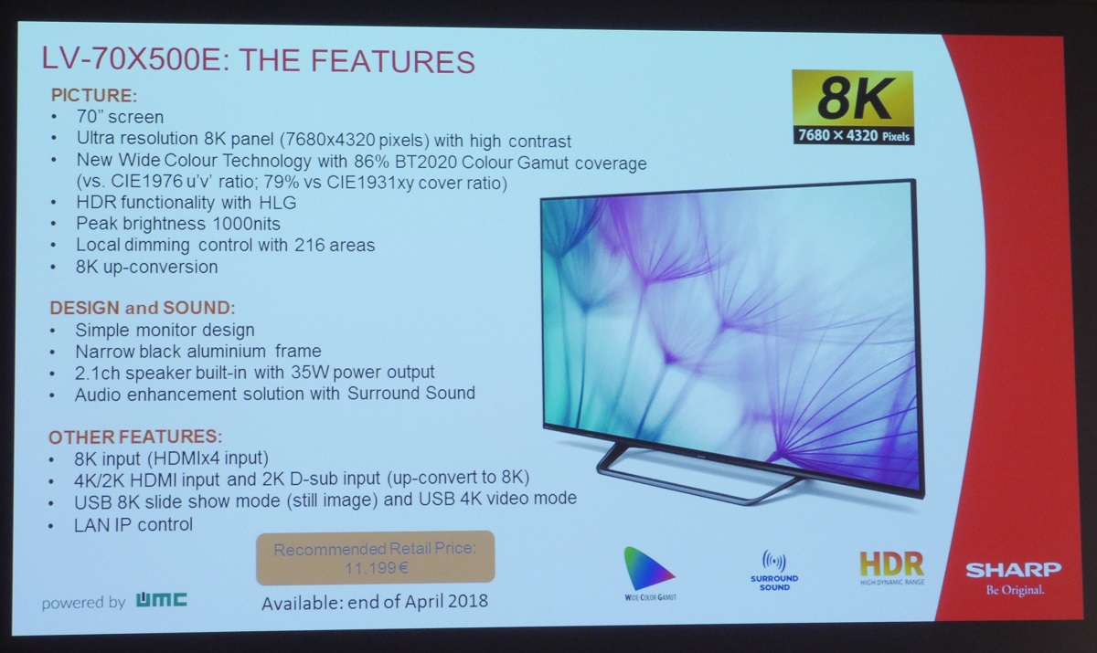 Roma, 20 Aprile 2018. In occasione della Global Press Conference IFA, Sharp ha annunciato che il TV a risoluzione UHD 8K (7680x4320) LV-70X500E con diagonale da 70", sarà in vendita anche in Europa a partire dalla fine del mese di Aprile. Il TV è già disponibile dallo scorso Ottobre in Cina, da Dicembre in Giappone e dallo scorso Febbraio 2018 anche in Taiwan, ha una retroilluminazione FALD (Full Array Local Dimming) a 216 zone, una luminanza massima di 1000 NIT e copre lo spazio colore REC.2020 fino all'86%.